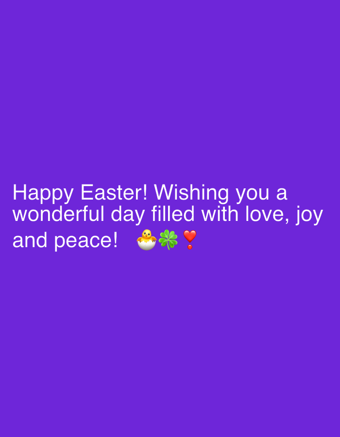 This image is a purple background with the text "Happy Easter! Wishing you a wonderful day filled with love, joy, and peace!" followed by emojis of a chick, a four-leaf clover, and a heart. The image…read more