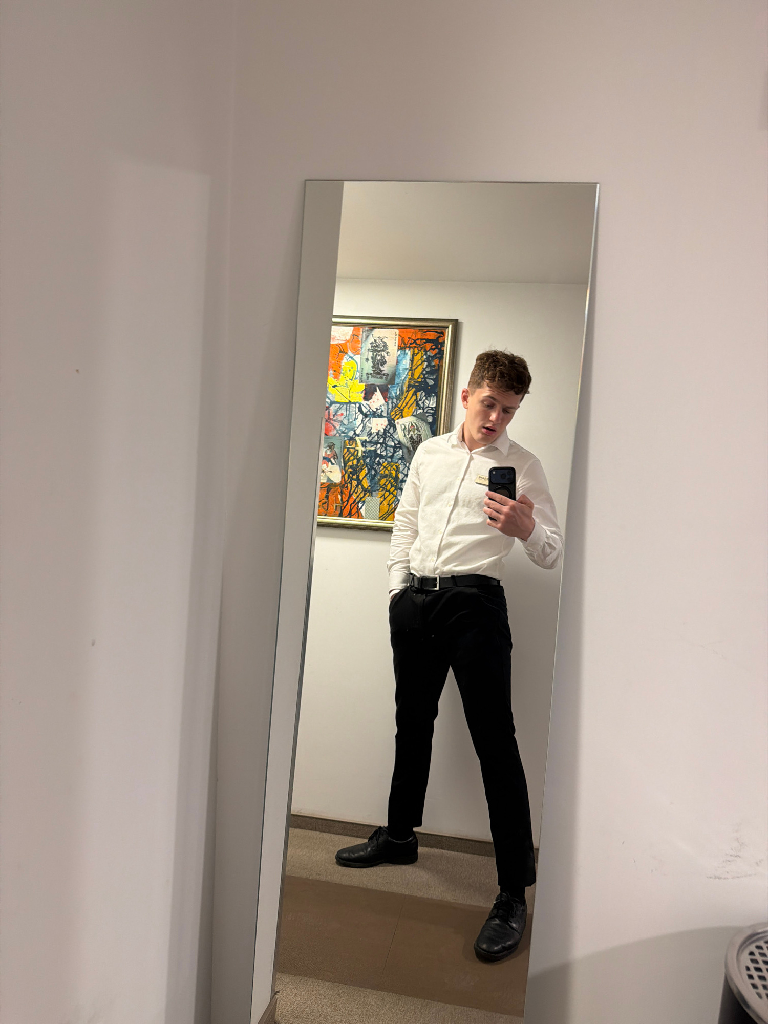 A young man stands in front of a mirror, taking a picture of himself with his smartphone. He is wearing a white dress shirt, black pants, and black shoes. Behind him is a framed, colorful, modern abst…read more