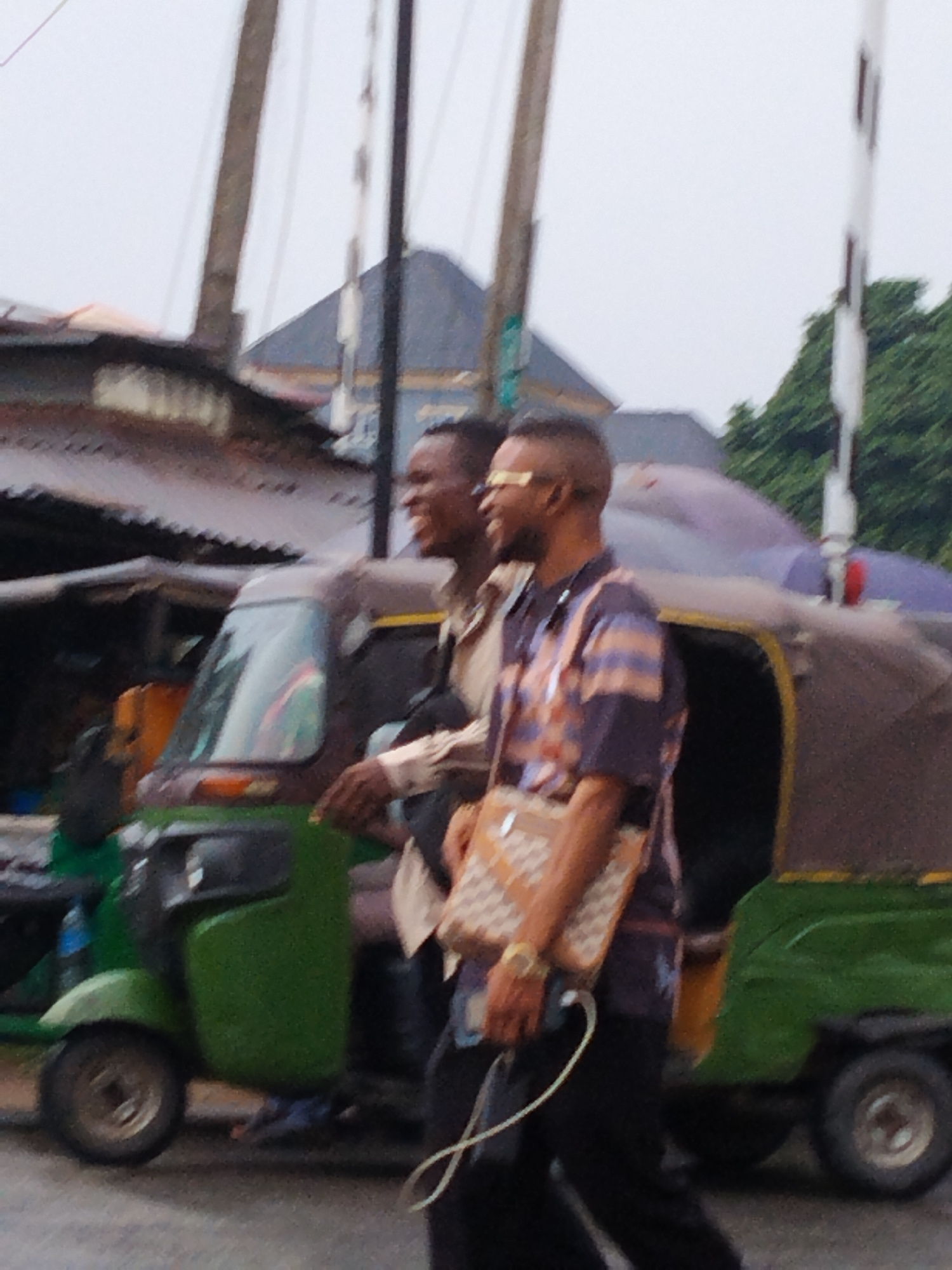 Two men are walking along a street in Umuode, Nigeria. One man is wearing a light tan shirt and dark pants; the second man wears a dark short-sleeved shirt with orange and blue horizontal stripes, dar…read more