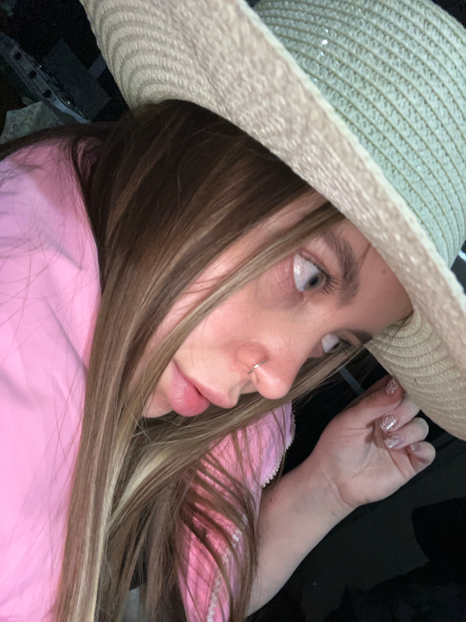 A person wearing a light-colored straw hat and a pink top is looking upwards. They have light skin, brown hair with blonde highlights, and a nose ring. One hand is visible near the hat. The background…read more