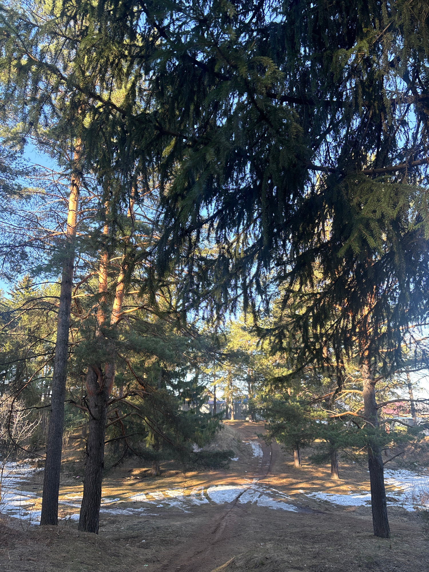 The image displays a serene outdoor scene in a coniferous forest or park, located in Chaikovsky, Russia. The perspective is from a low angle, looking upwards into the dense canopy of evergreen trees.…read more