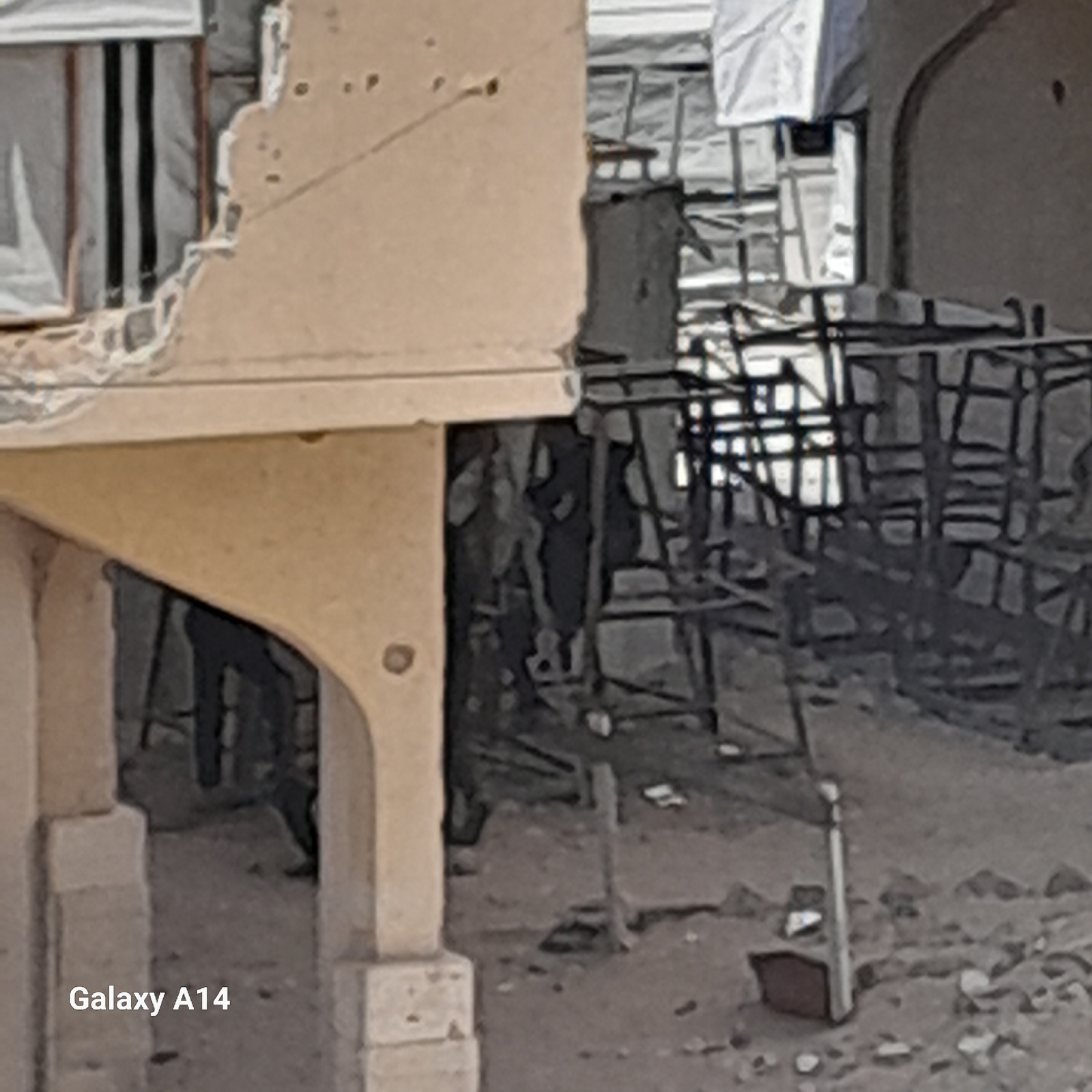 This image depicts a severely damaged interior of a building, likely located in Khan Yunis, Palestinian Territory, given the context. The scene is characterized by widespread destruction and debris.…read more