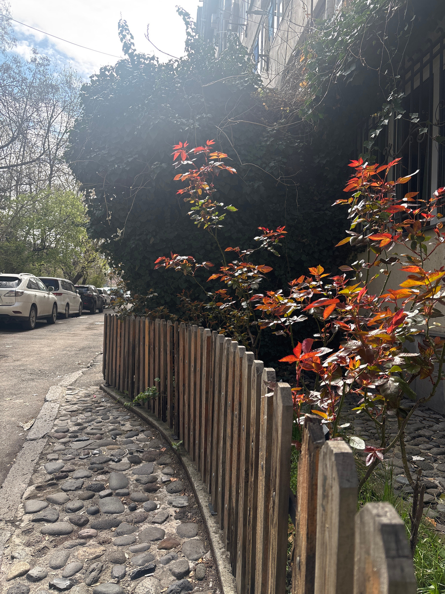 The image shows a street scene in Yerevan, Armenia. A row of white cars is parked along the right side of the street. A low wooden fence runs alongside the street, bordered by a stone retaining wall c…read more