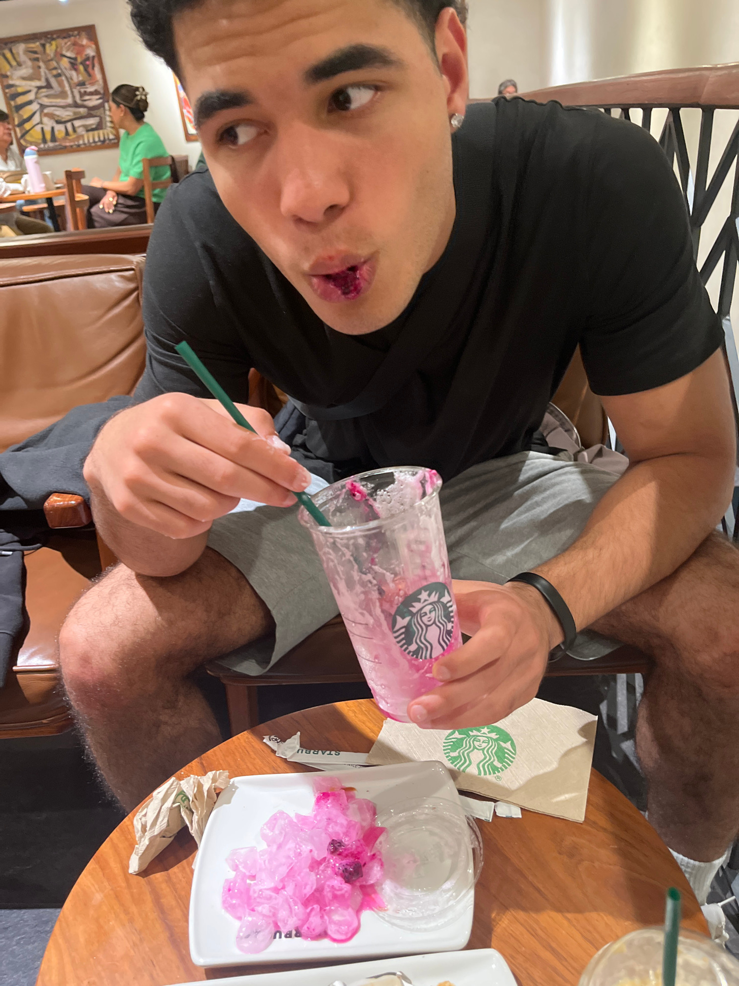 A person is seen close-up, holding a Starbucks cup with pink residue and a green straw. The person has pink residue around their mouth, suggesting they have been consuming the drink. Next to the cup o…read more