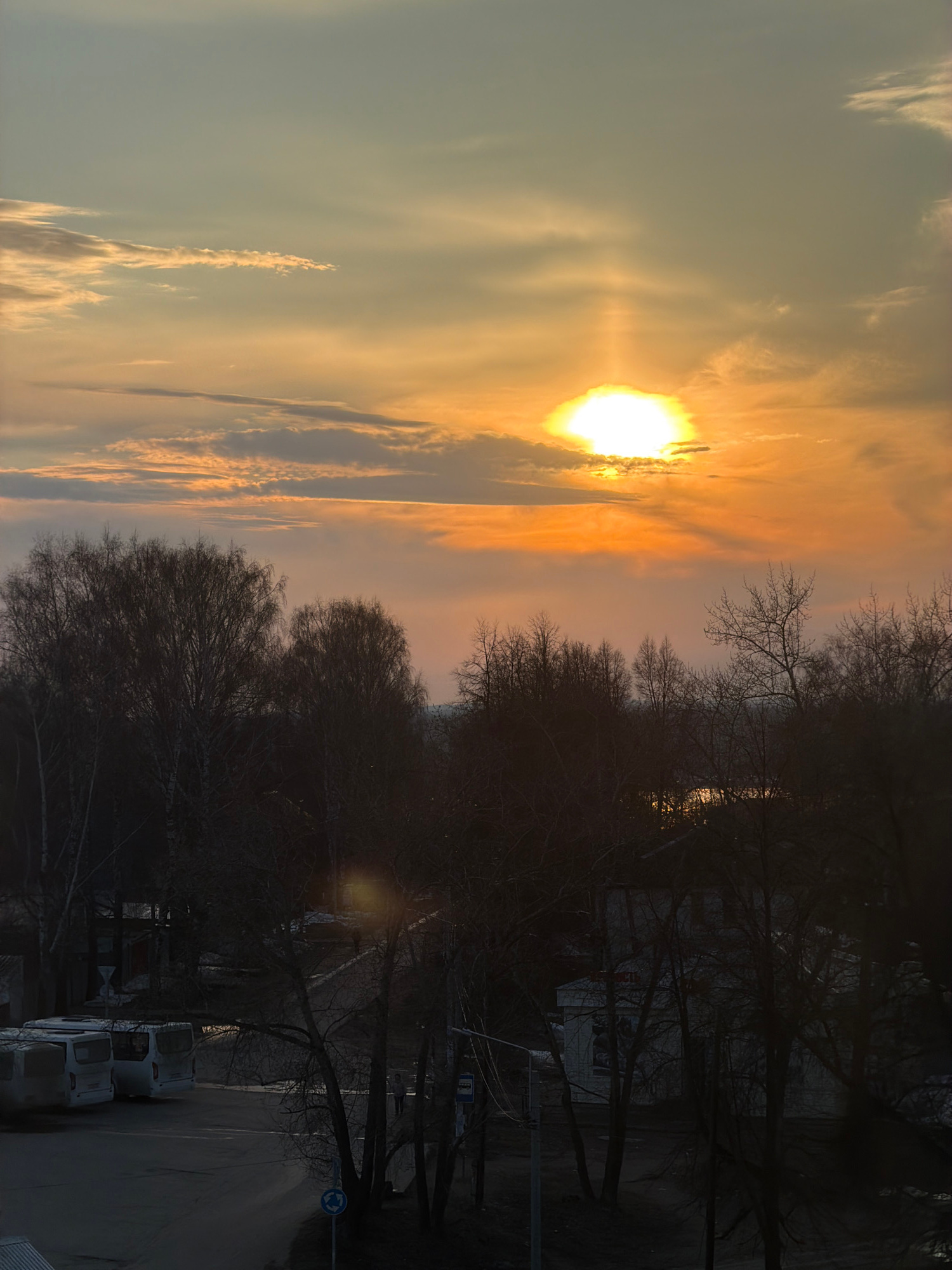 The image captures a scene in the city of Chaikovsky, Russia, during a sunset. The sun is positioned on the left, partially obscured by clouds, casting an orange and yellow glow across the sky. The ri…read more