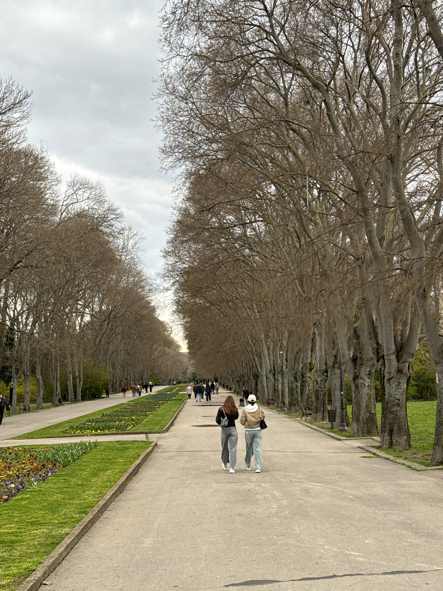 The image depicts a long, straight pedestrian walkway lined with rows of bare trees. Two people are walking along the path, with several other individuals and groups further in the distance. The walkw…read more