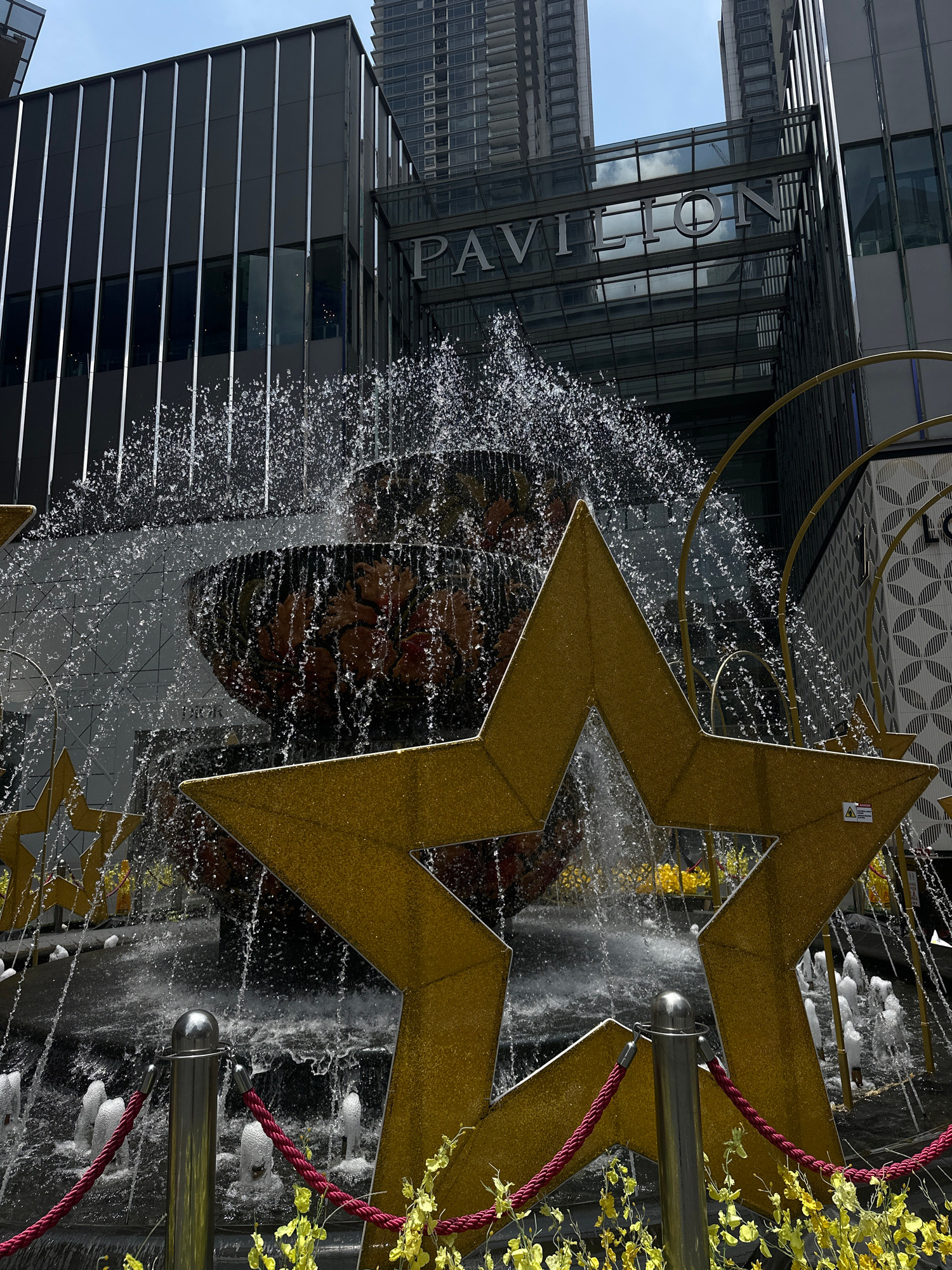 The image shows a water feature with gold stars in front of the Pavilion Kuala Lumpur shopping mall. Water sprays from the fountain. The Pavilion's building is visible in the background. Ropes are on…read more