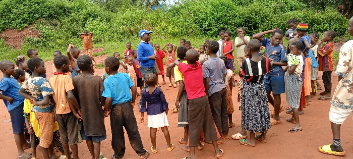 An outdoor scene in Ngalula, Democratic Republic of the Congo, depicts approximately 30 individuals, predominantly children, gathered on a reddish-brown dirt ground. An adult male, wearing a blue long…read more