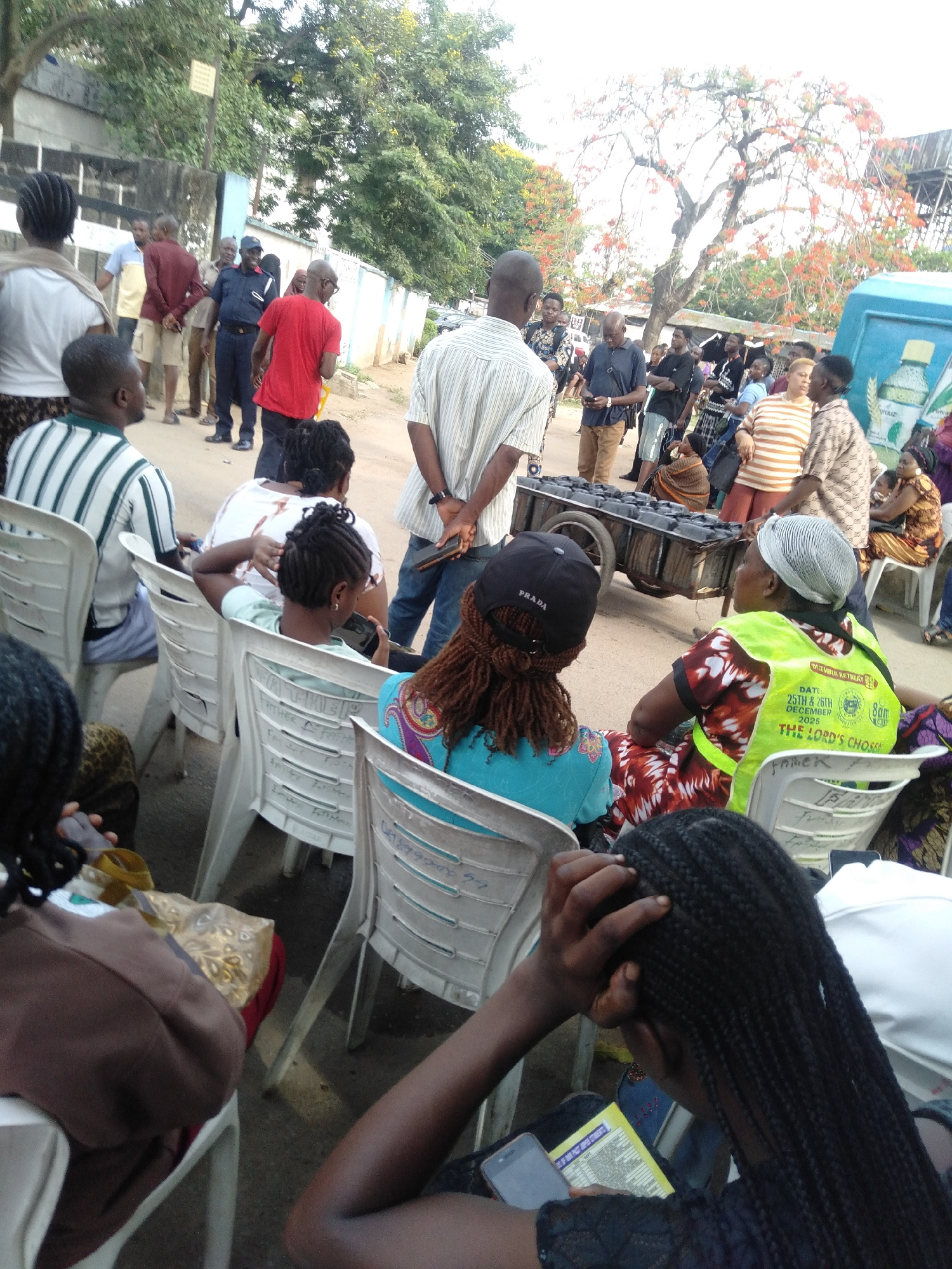 The image shows a gathering of people in Lagos, Nigeria. Many individuals are seated on white plastic chairs, while others stand in groups. A man pushes a small cart loaded with rectangular objects co…read more