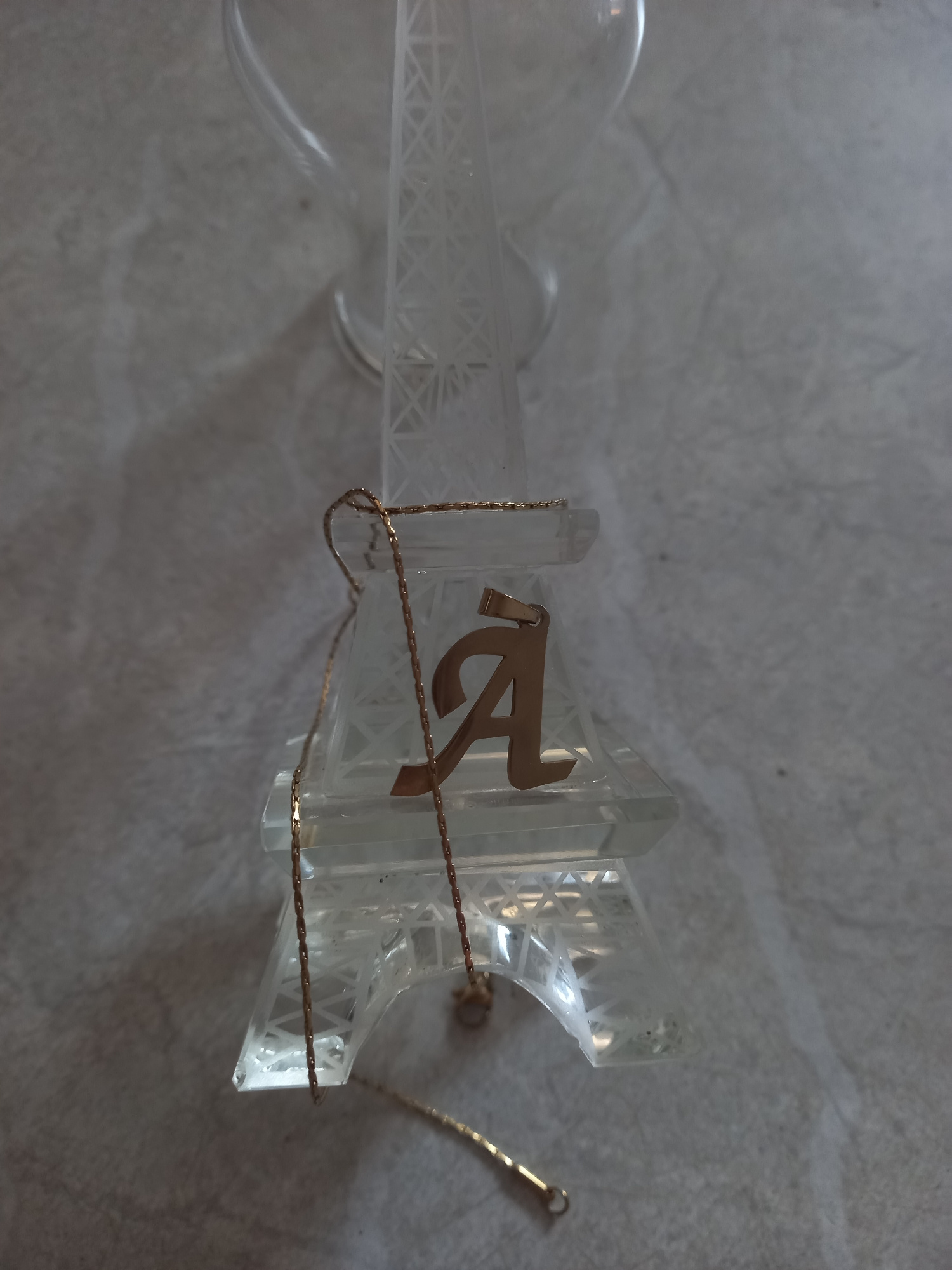 The image shows a miniature Eiffel Tower souvenir, made primarily of clear glass. The tower is lying horizontally on a textured, grey-white surface. A gold-colored, cursive letter "R" is affixed to th…read more