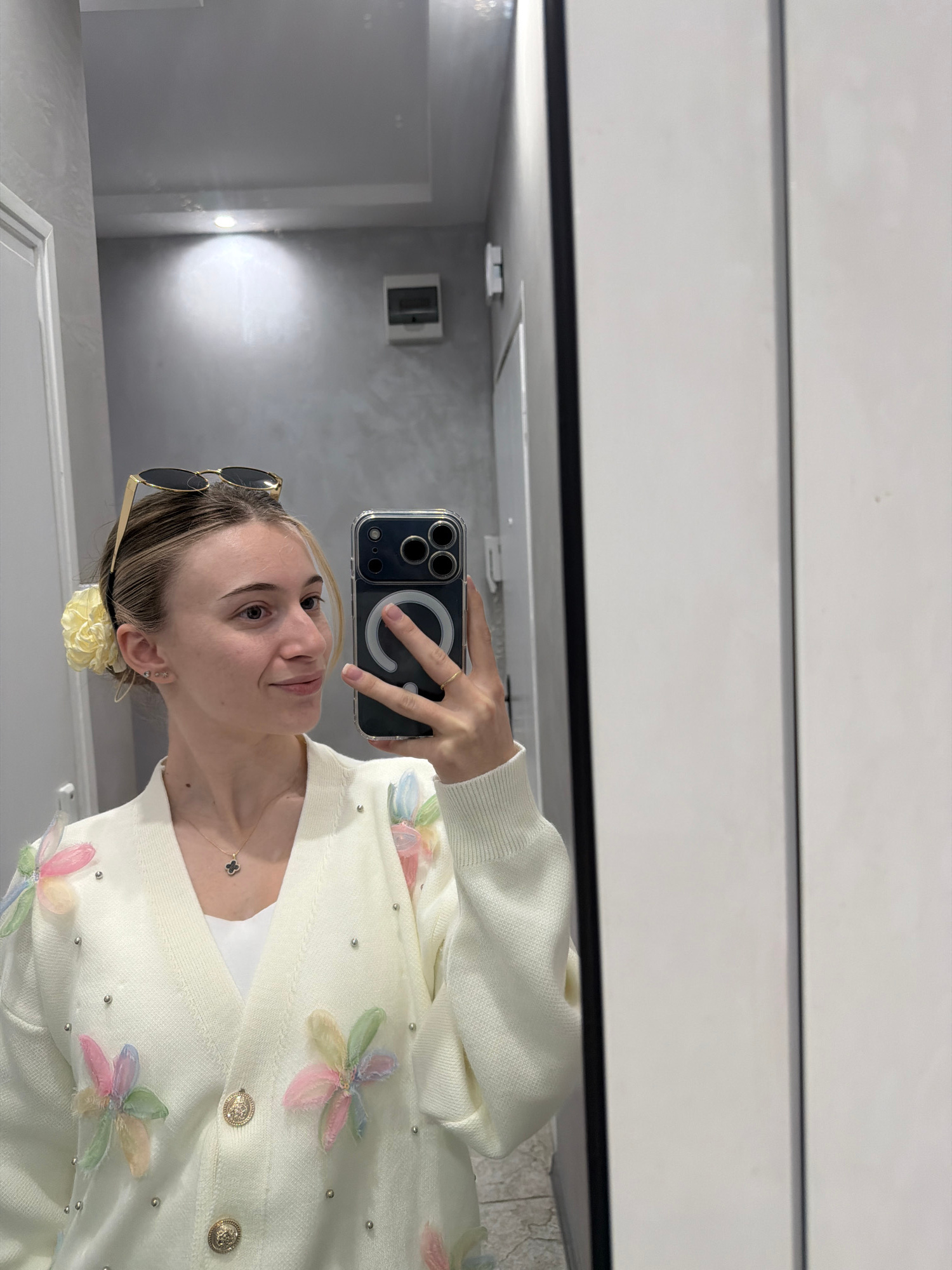 The image appears to be a mirror selfie taken indoors, with a woman in the foreground. She is holding a smartphone up to the mirror, capturing her reflection. She is wearing a white cardigan decorated…read more