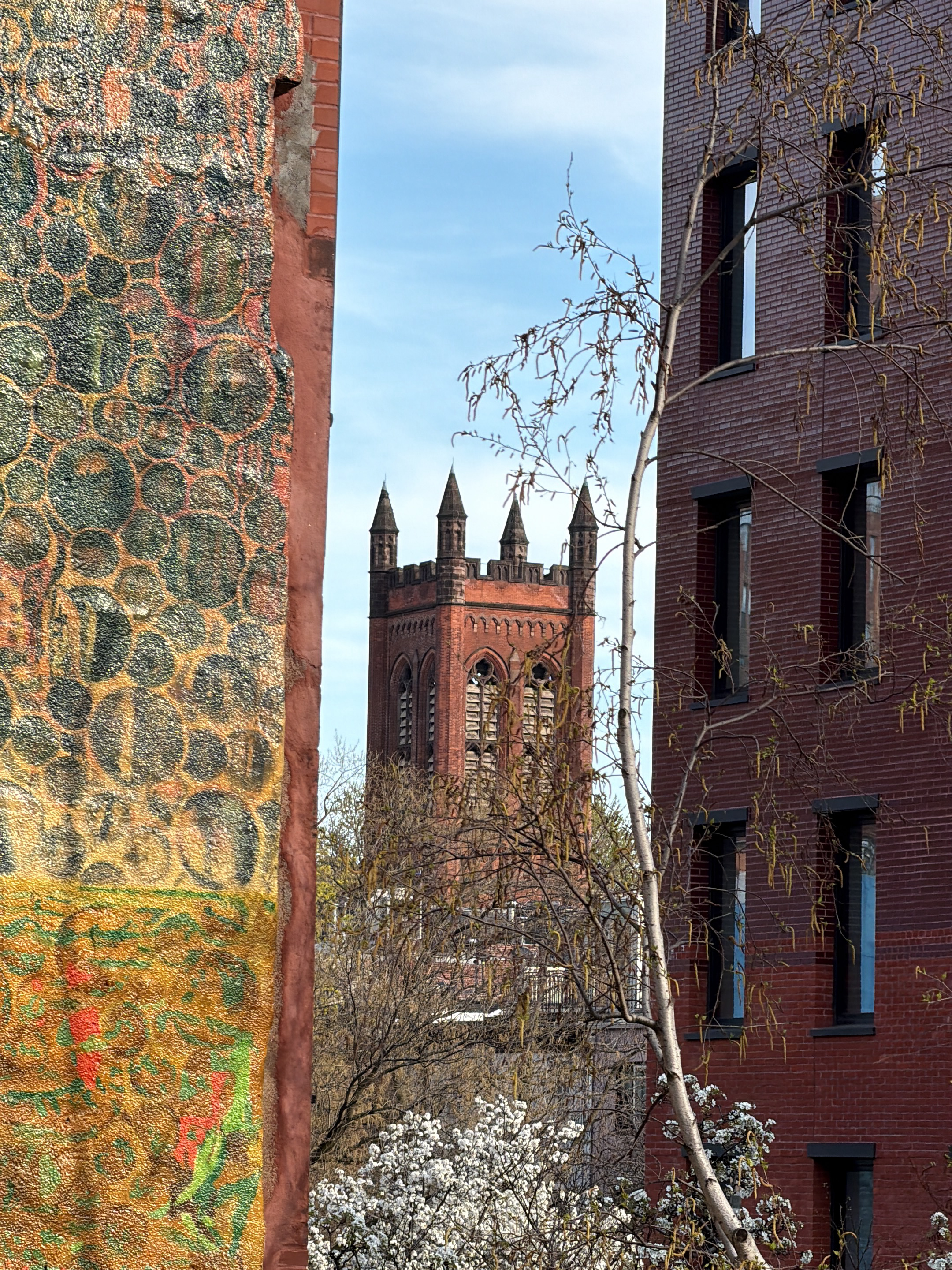 The image depicts a street scene in New York City, United States, framing a brick church tower between two buildings. The building on the left displays a textured, colorful mural. The building on the…read more