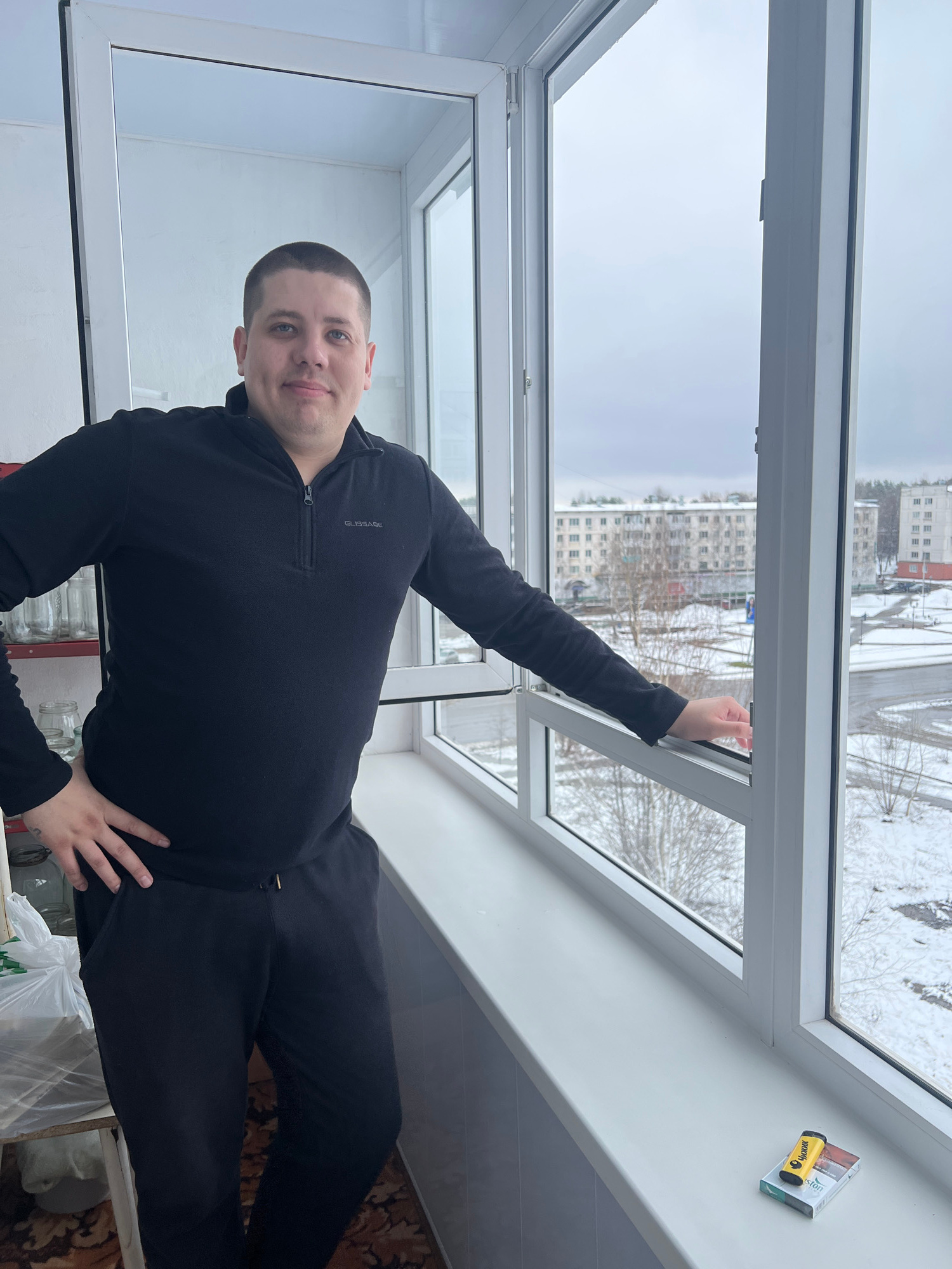A man in a black long-sleeved shirt and black pants is standing in front of a white window, looking at the camera. His left hand is on his hip, and his right arm is extended upwards towards the window…read more