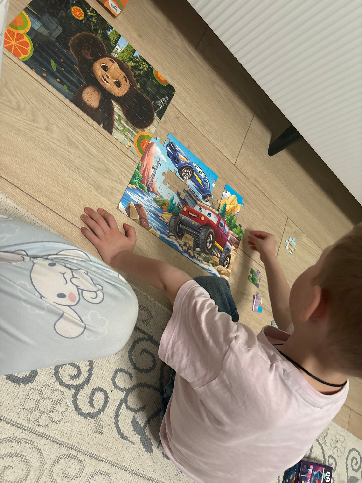 A young child is sitting on the floor, assembling two separate jigsaw puzzles. One puzzle features cartoon race cars and the other depicts a cartoon monkey. The scene is located in an interior setting…read more