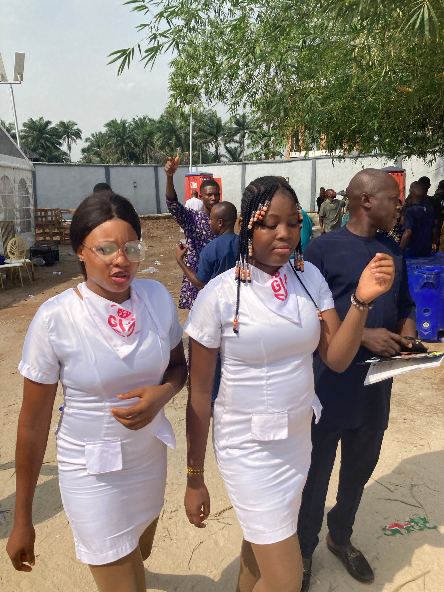 The scene depicts several individuals outdoors in Nnenu, Nigeria. Two women wearing white uniforms with red insignia stand prominently in the foreground. Behind them are other people, including a man…read more