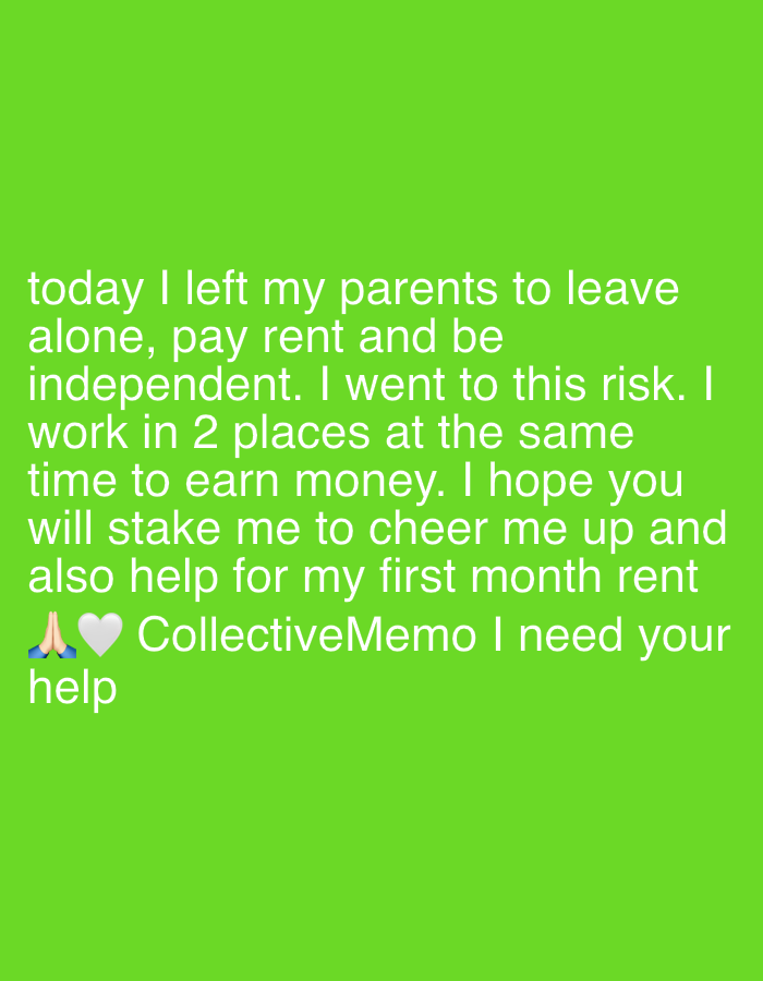 The image displays white text against a solid, uniform green background. The text, centered vertically and left-aligned, reads: "today I left my parents to leave alone, pay rent and be independent. I…read more