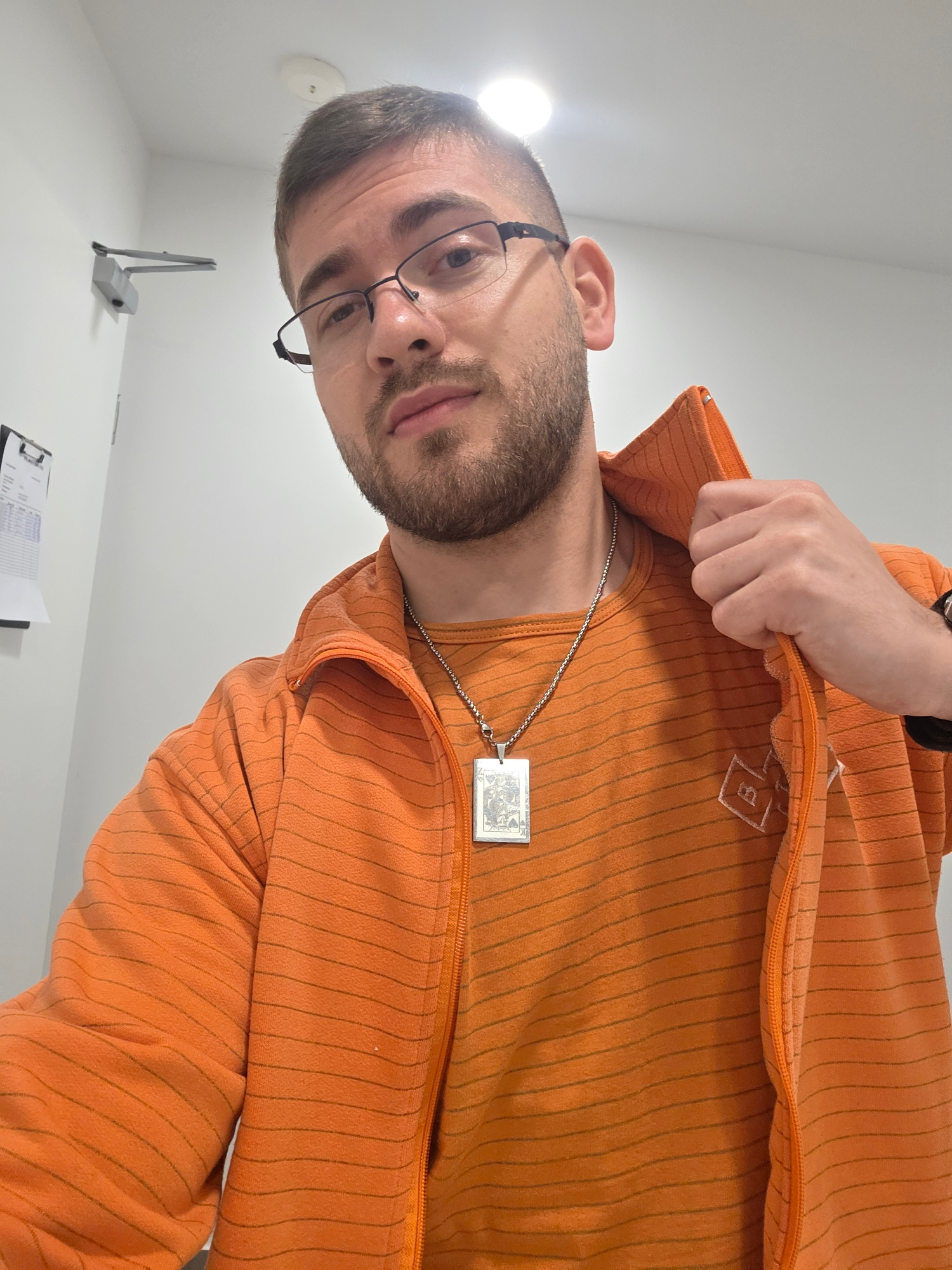 A man with short brown hair, a beard, and glasses is wearing an orange striped jacket and a silver necklace with a rectangular pendant. The setting appears to be indoors with white walls and a fluores…read more