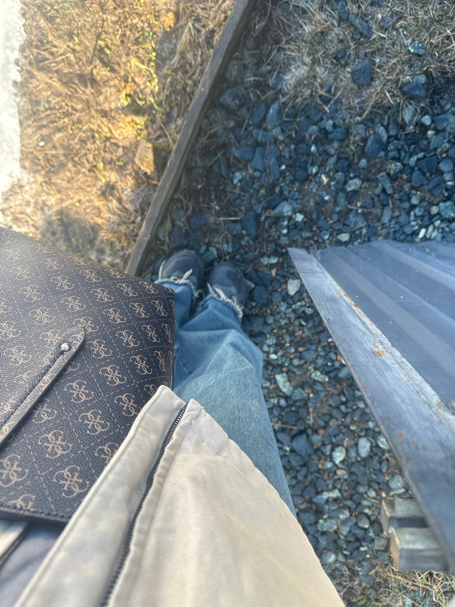 The image shows a first-person perspective looking down at the ground, possibly taken in an outdoor environment. The ground consists of gravel and patches of dry grass or vegetation. There are pieces…read more