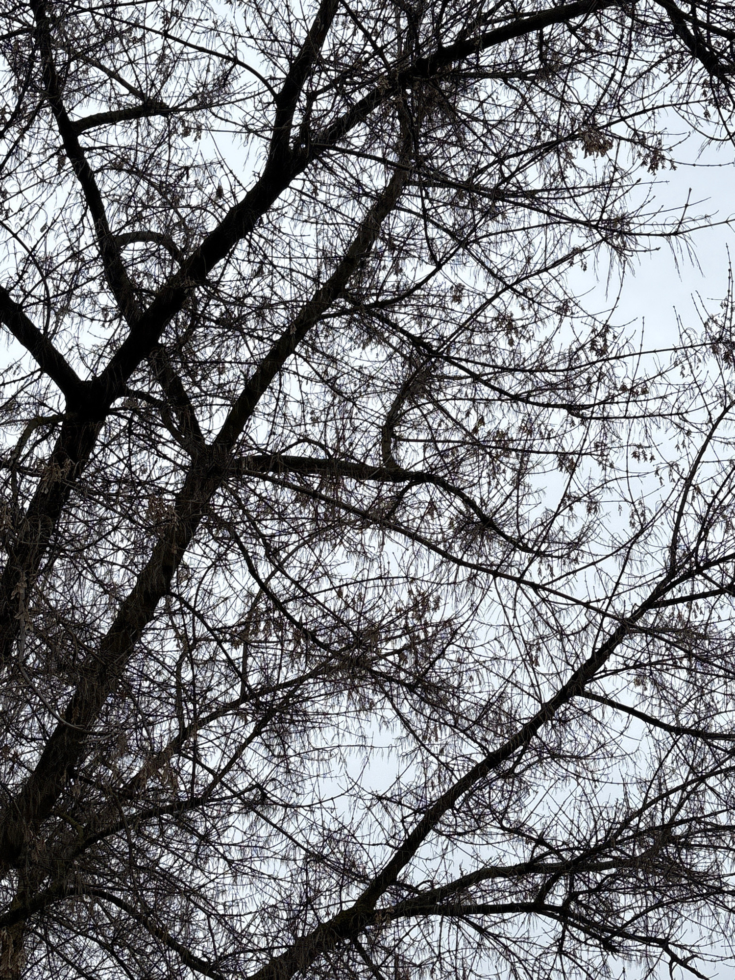 The image shows a view looking up into the bare branches of trees against a pale sky. The thick branches are dark and intertwined, with a complex network of smaller twigs and branches filling the spac…read more