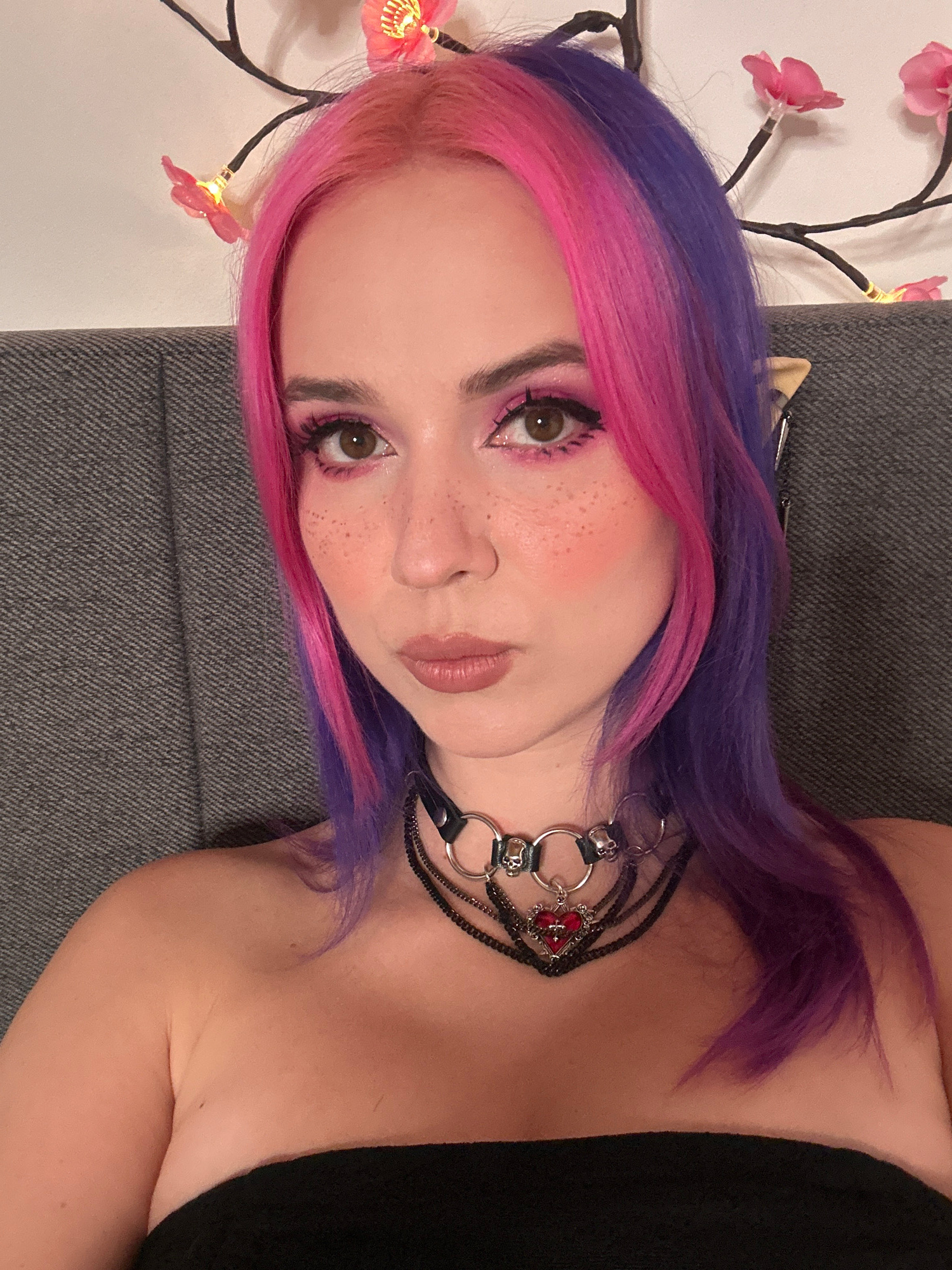 The image is a portrait of a person with pink and purple hair. They have fair skin, brown eyes, and freckles on their nose and cheeks. They are wearing pink eyeshadow and lip gloss. They have a black…read more