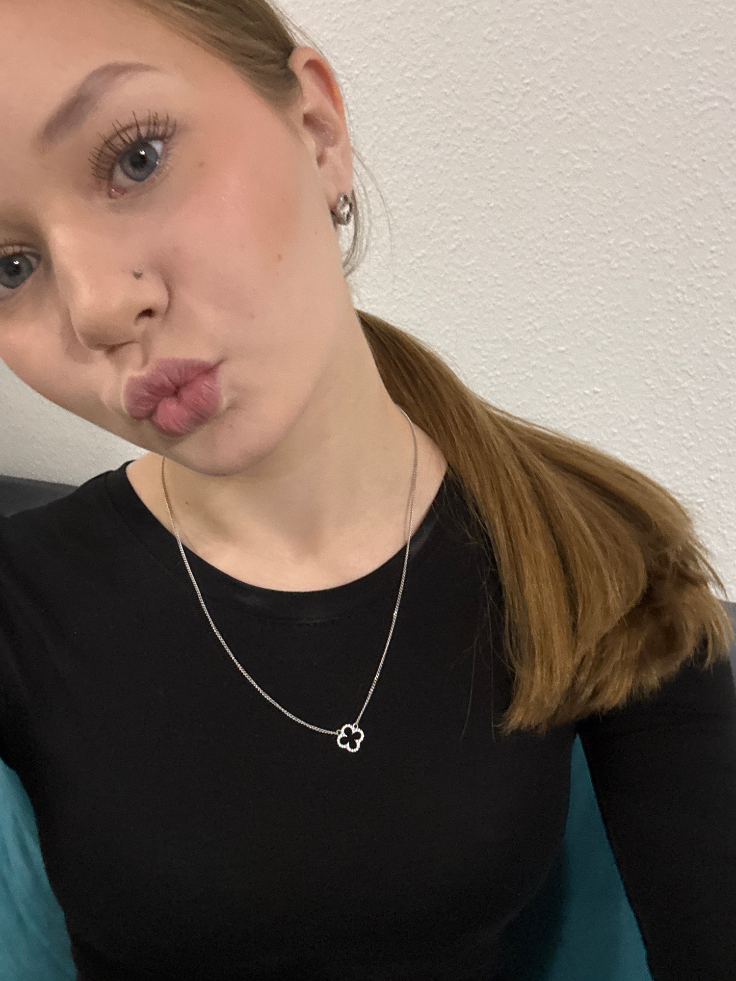 A close-up, angled portrait of a young woman with light skin and blue eyes, pouting her lips towards the camera. She is wearing a black long-sleeved shirt and a silver necklace with a four-leaf clover…read more