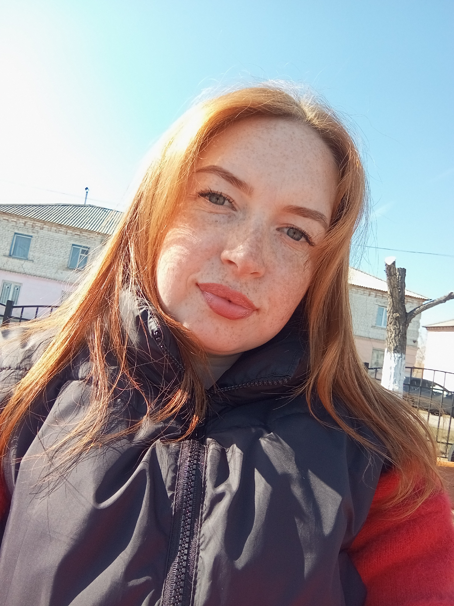 A close-up, tilted, outdoor selfie shows a young, light-skinned woman with freckles, green eyes, and reddish-orange hair sticking her tongue out playfully. She wears a black jacket with a visible zipp…read more
