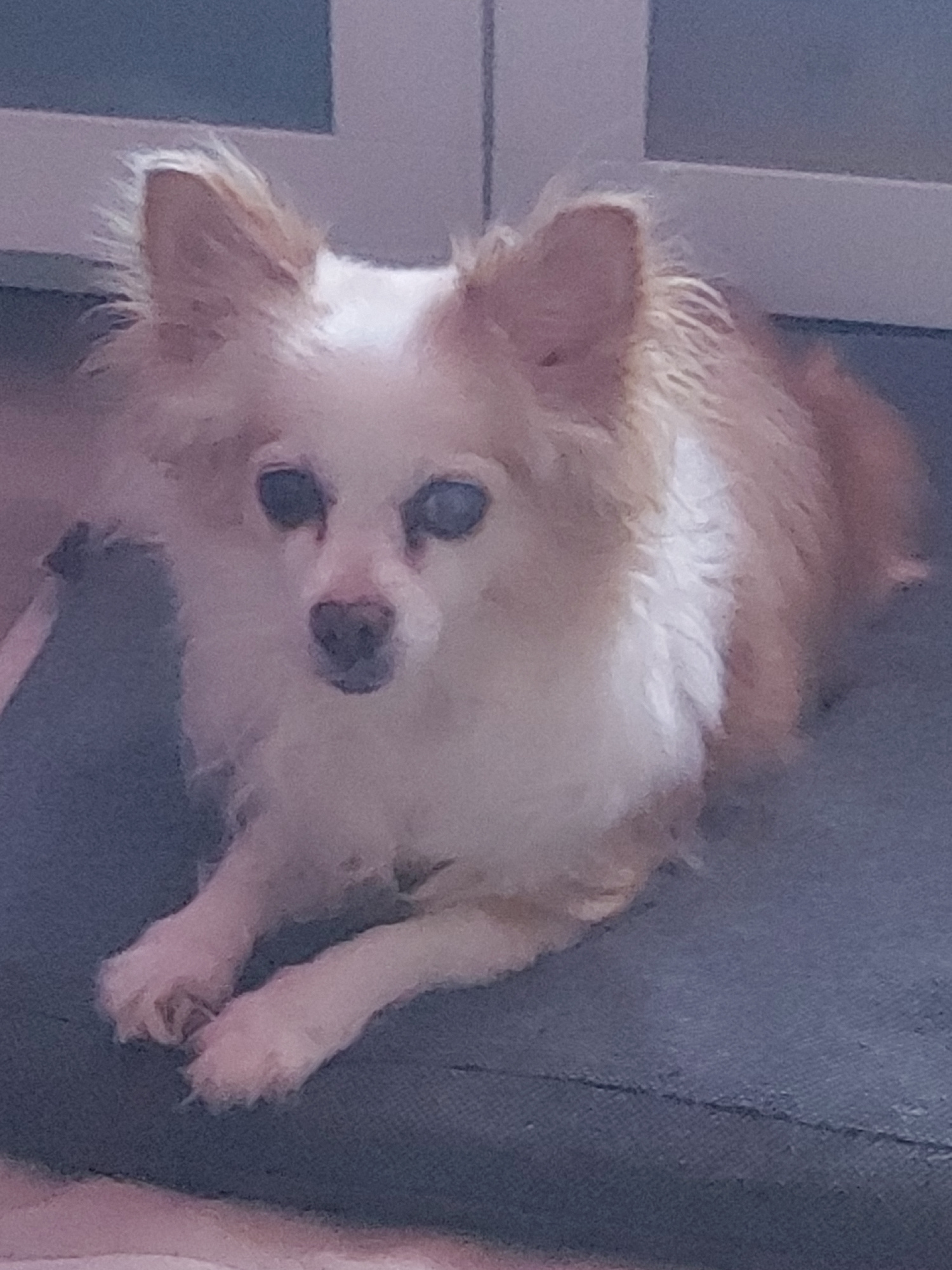 An indoor, eye-level shot captures a small, long-haired dog, likely a Chihuahua or similar breed, with a mix of light brown and white fur. The dog is positioned centrally, looking directly upwards tow…read more