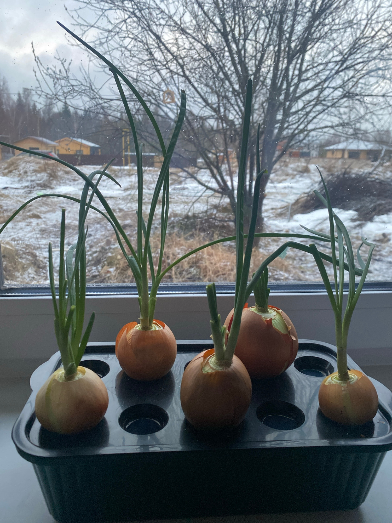 On a windowsill, five onions with green shoots are growing in a dark gray planter. Outside the window, a winter scene in Izhevsk, Russia, is visible. Bare trees stand against a backdrop of snow-covere…read more