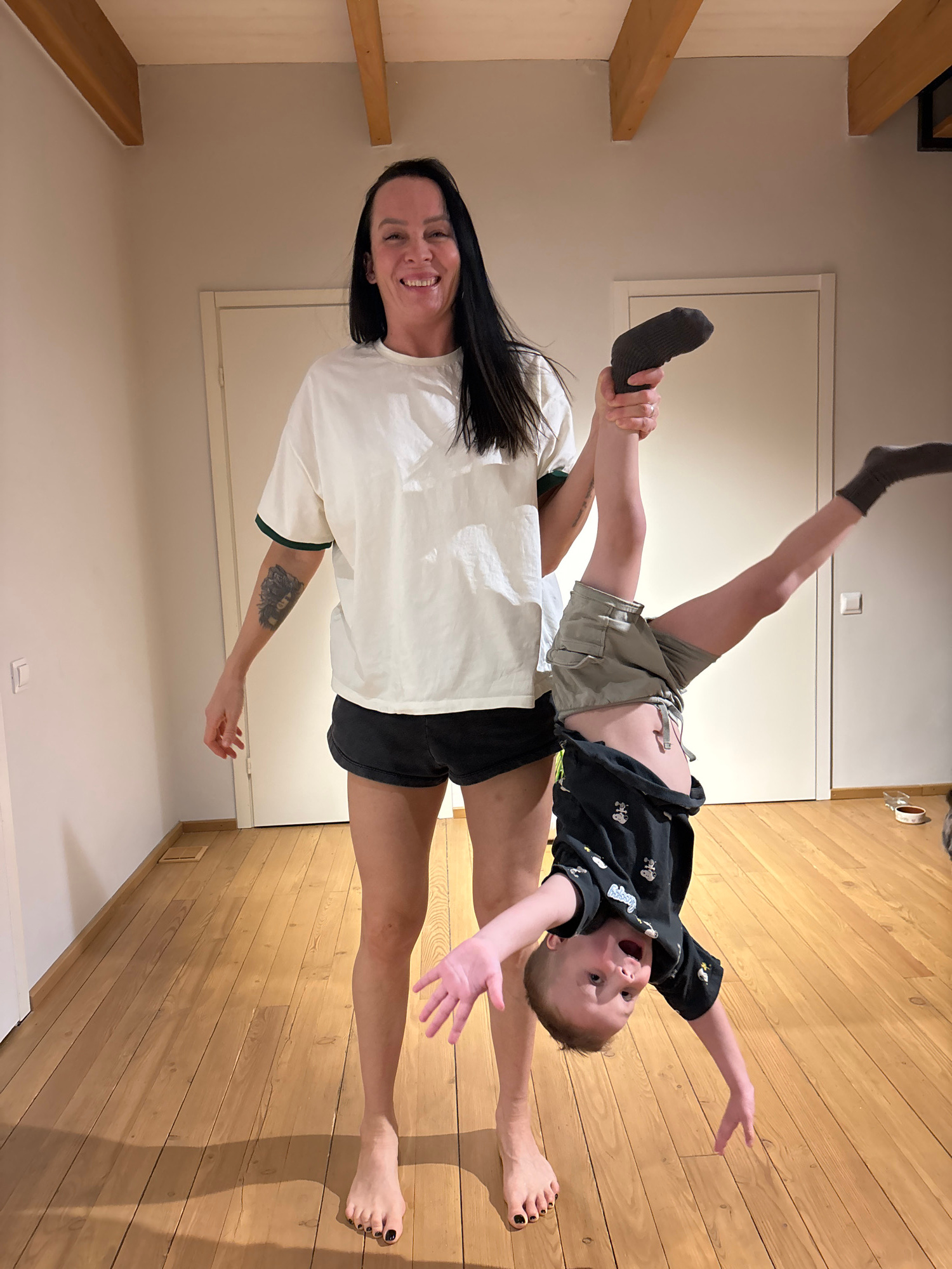 A woman is lying on her back on a wooden floor, holding a boy in the air with her feet. The boy is lying horizontally across her legs, with his arms outstretched. The woman is smiling and looking at t…read more