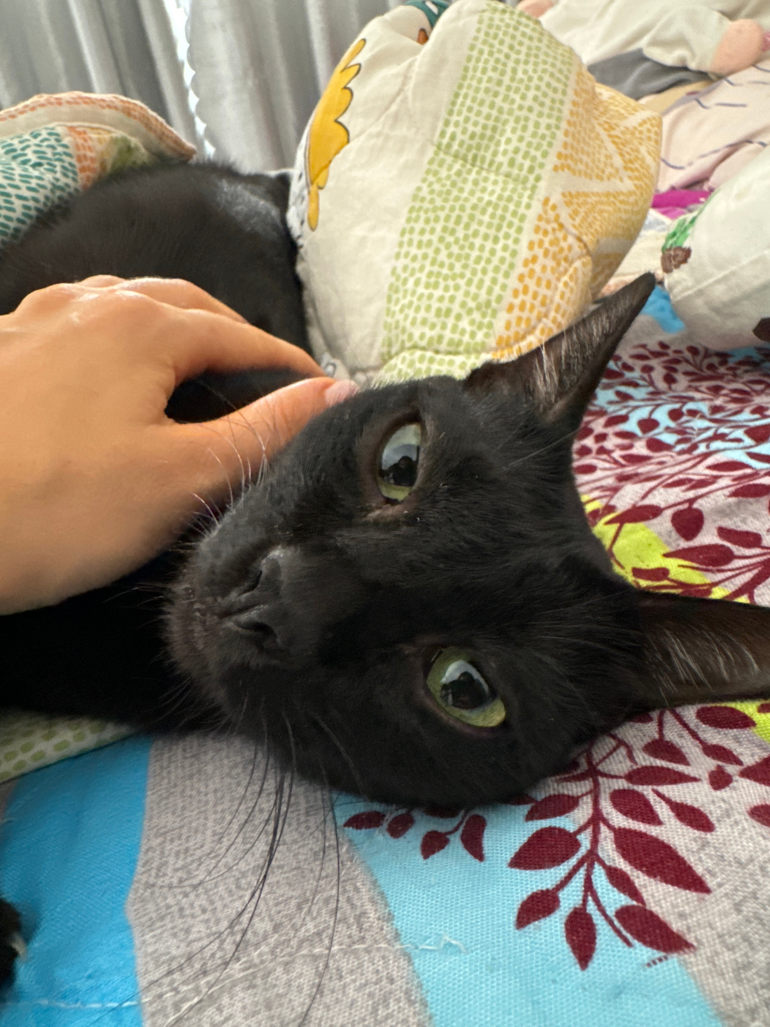 A black cat with green eyes lies on a bed covered in patterned bedding. A fair-skinned human hand is stroking the cat's cheek. The bedding has various colors and patterns, including yellow, green, blu…read more