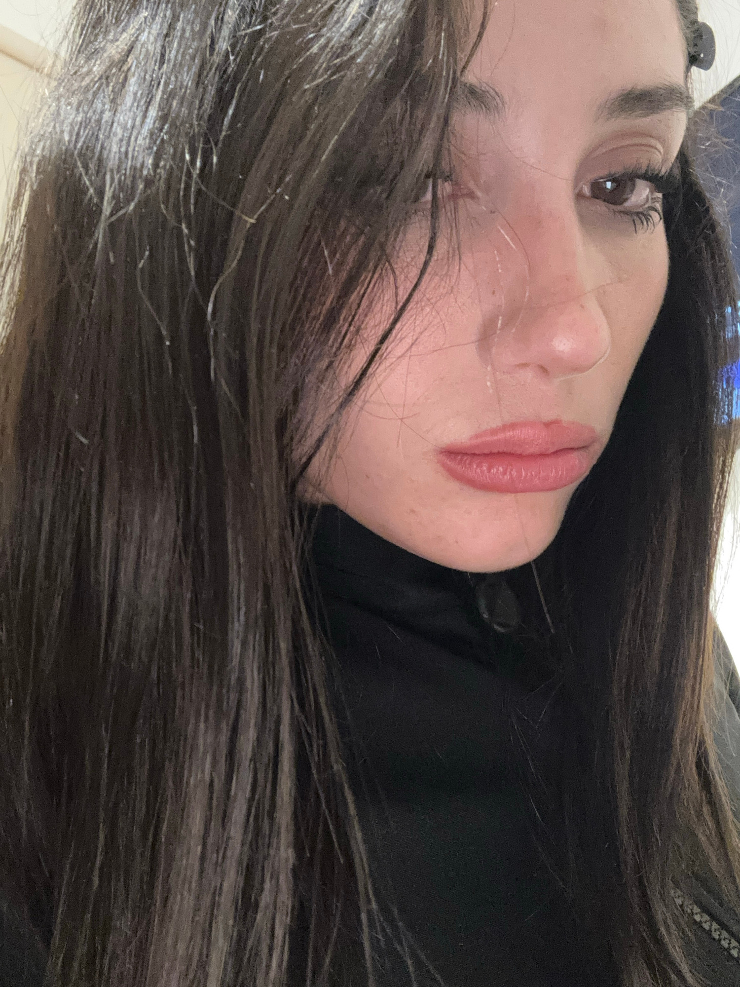 A close-up image of a woman's face, rotated counterclockwise. Her dark hair is spread around her face. She has light skin, dark eyes, and is wearing lipstick. The background is indistinct, suggesting…read more