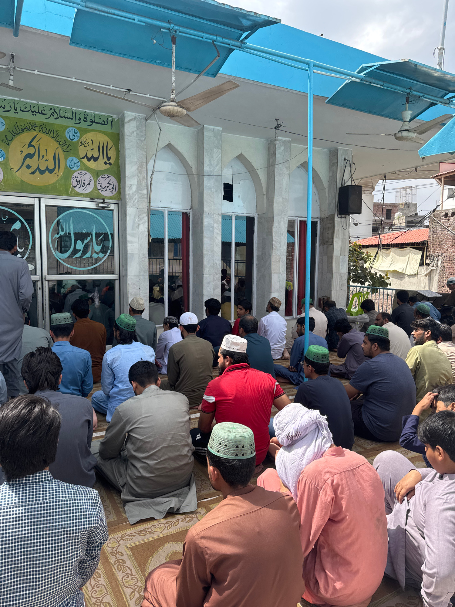 A large group of Muslim men and boys are captured in a moment of congregational prayer (Salah) outdoors, kneeling in the prostration (sujud) position with their foreheads to the ground. They are dress…read more