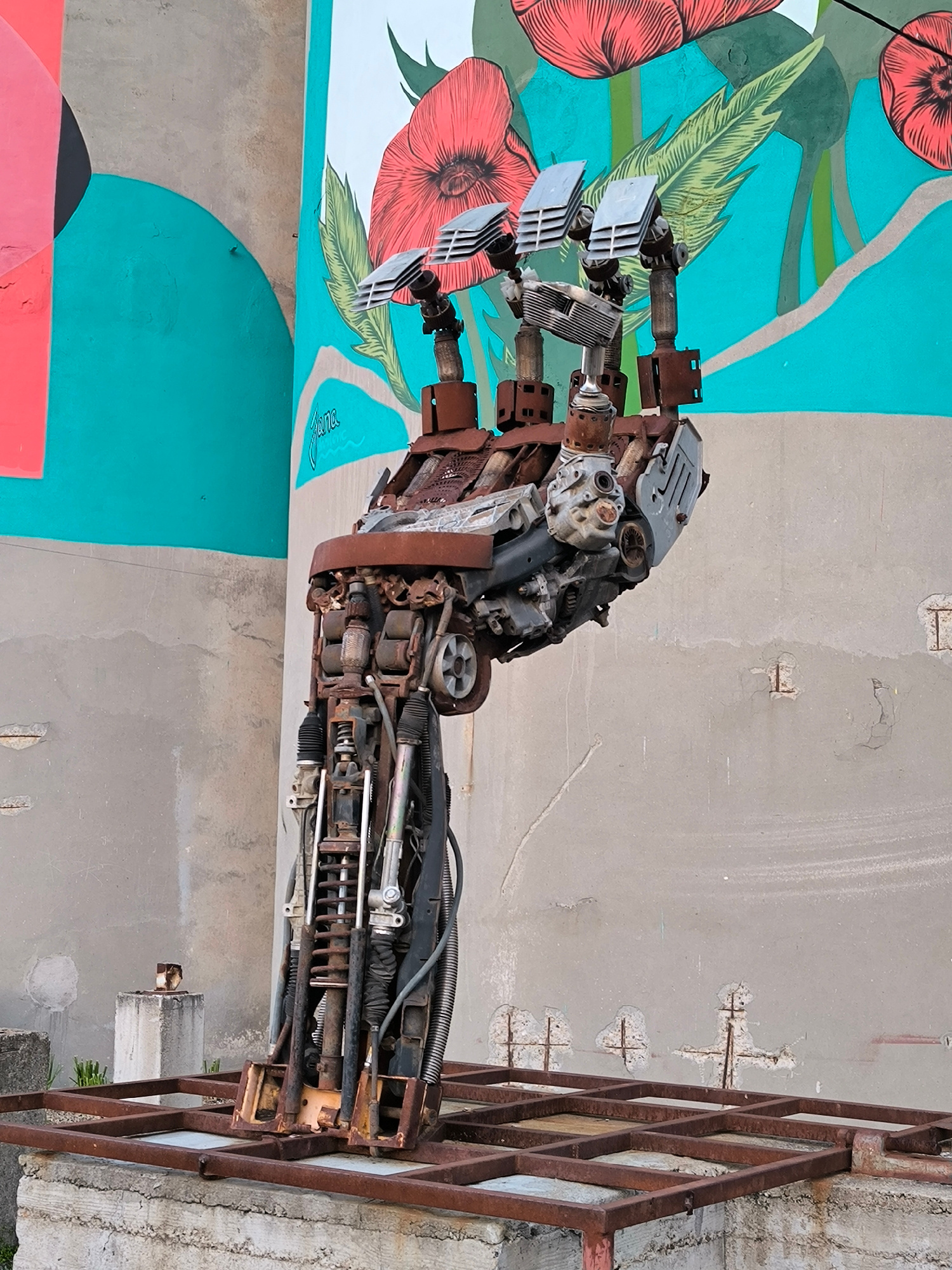 A full, eye-level shot of a large, rusty metal sculpture of a human hand. The sculpture is positioned on a low concrete platform with a grid of rusted metal bars around its base. The hand is construct…read more