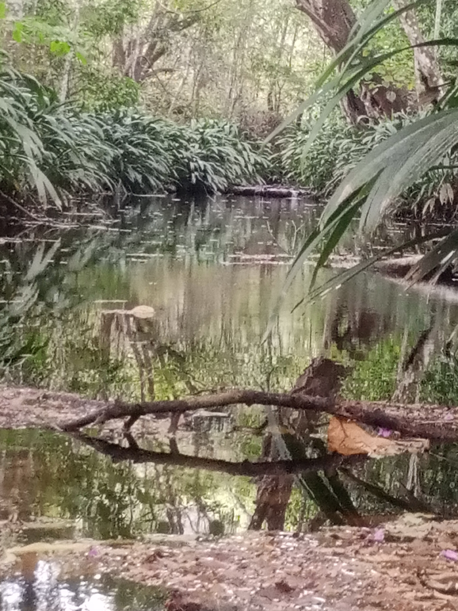 The image depicts a murky, slow-moving body of water, likely a stream or small pond, surrounded by dense vegetation. The water reflects the surrounding foliage, including trees, shrubs, and palm-like…read more