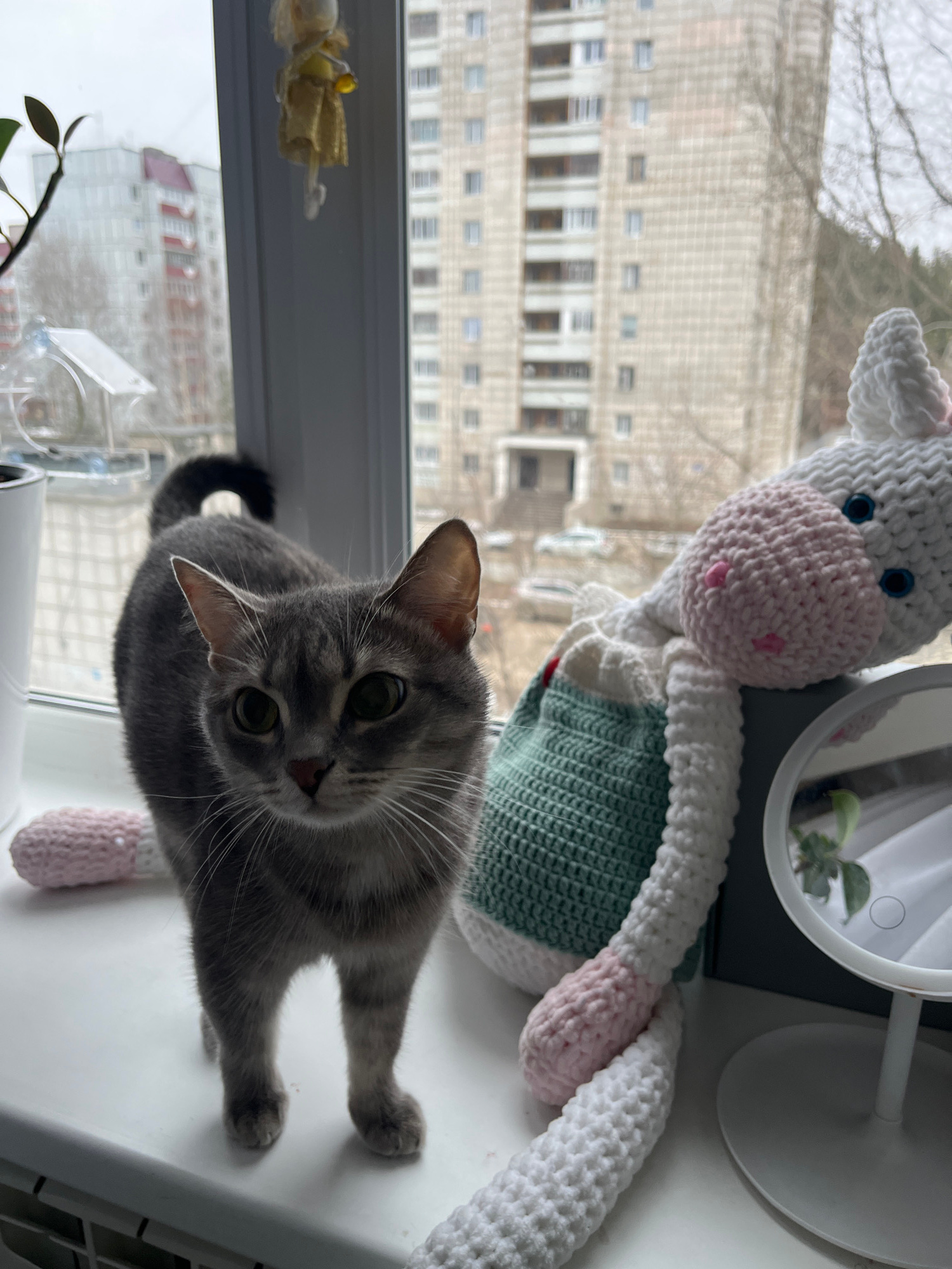 A gray tabby cat stands on a white windowsill, its tail curved slightly. Behind it, to the right, sits a crocheted toy cow with a pink nose and blue eyes, wearing a green vest. A round mirror with a w…read more