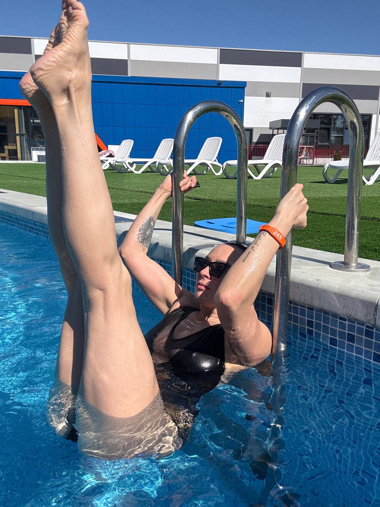 A woman in a black bathing suit and sunglasses is standing in a swimming pool, holding onto a metal ladder. She is wearing an orange wristband with the number "245" on it. Her legs are extended into t…read more