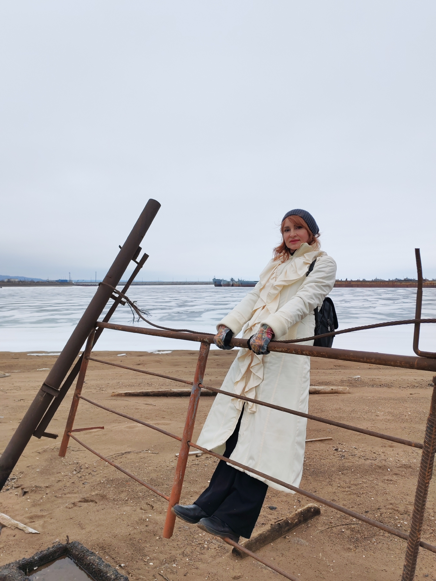 A woman is standing on a beach in Chaikovsky, Russia, leaning on a rusty metal structure. The woman is wearing a white coat with ruffles, black pants, black shoes, a grey knitted hat, and gloves with…read more