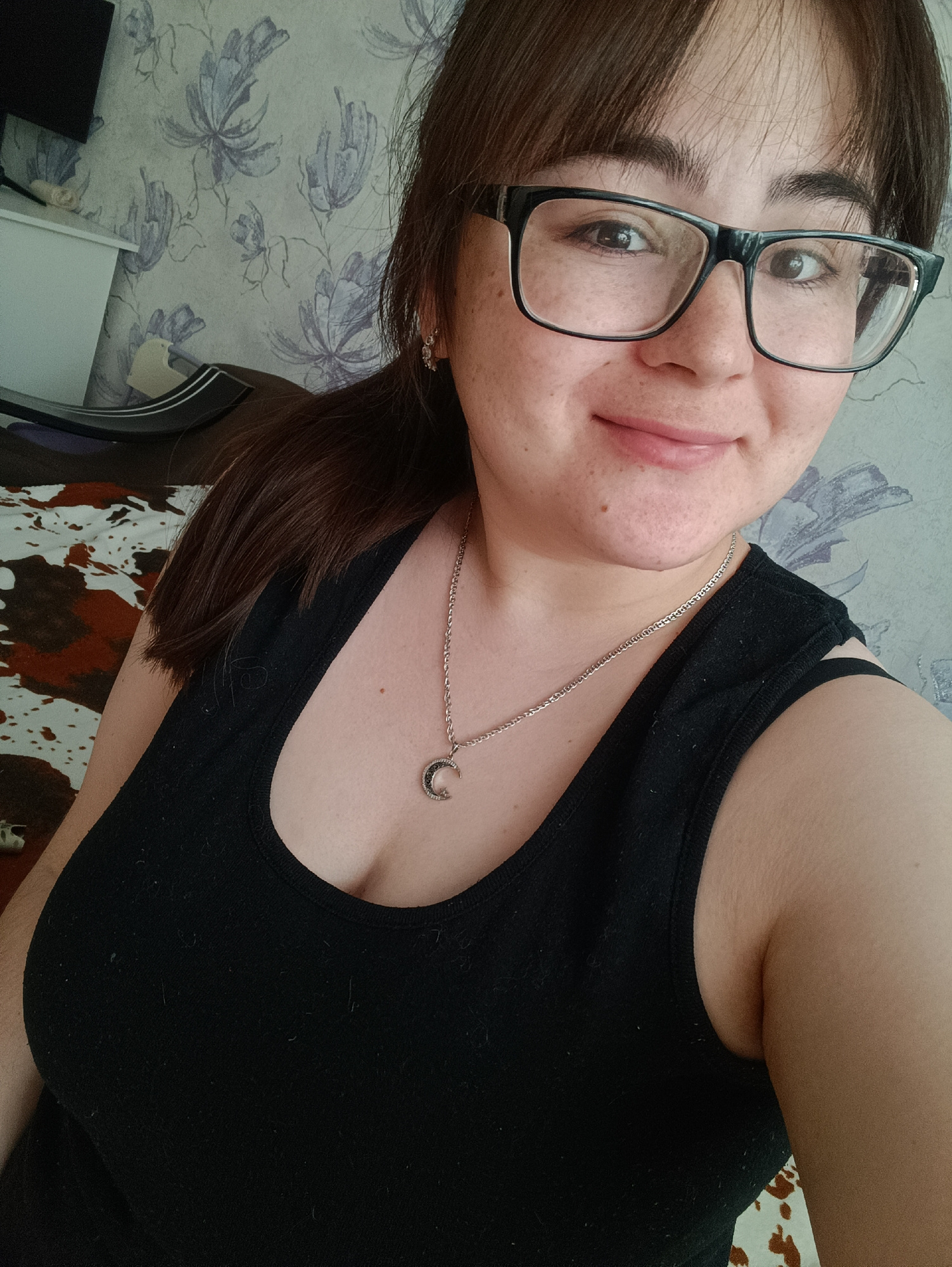 A young woman in Noviy, Russia, is depicted in a close-up, chest-up shot, likely a selfie, in an indoor setting. She has fair skin with visible freckles and a gentle, closed-mouth smile. Her dark brow…read more
