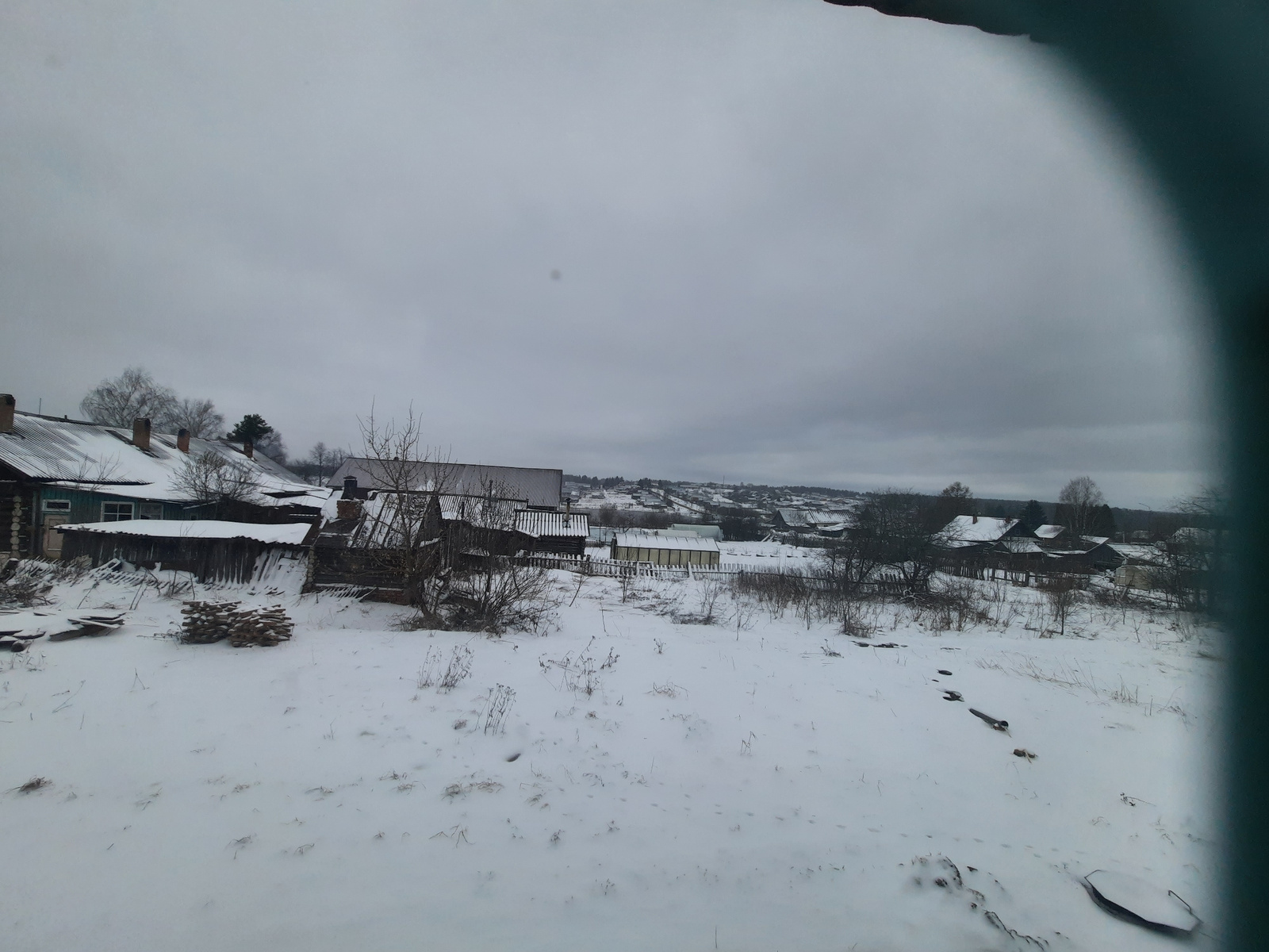 The image depicts a snow-covered rural scene, likely in the vicinity of Krasnogorskoye, Russia. Several wooden buildings, including houses and sheds, are visible in the background and midground. The r…read more