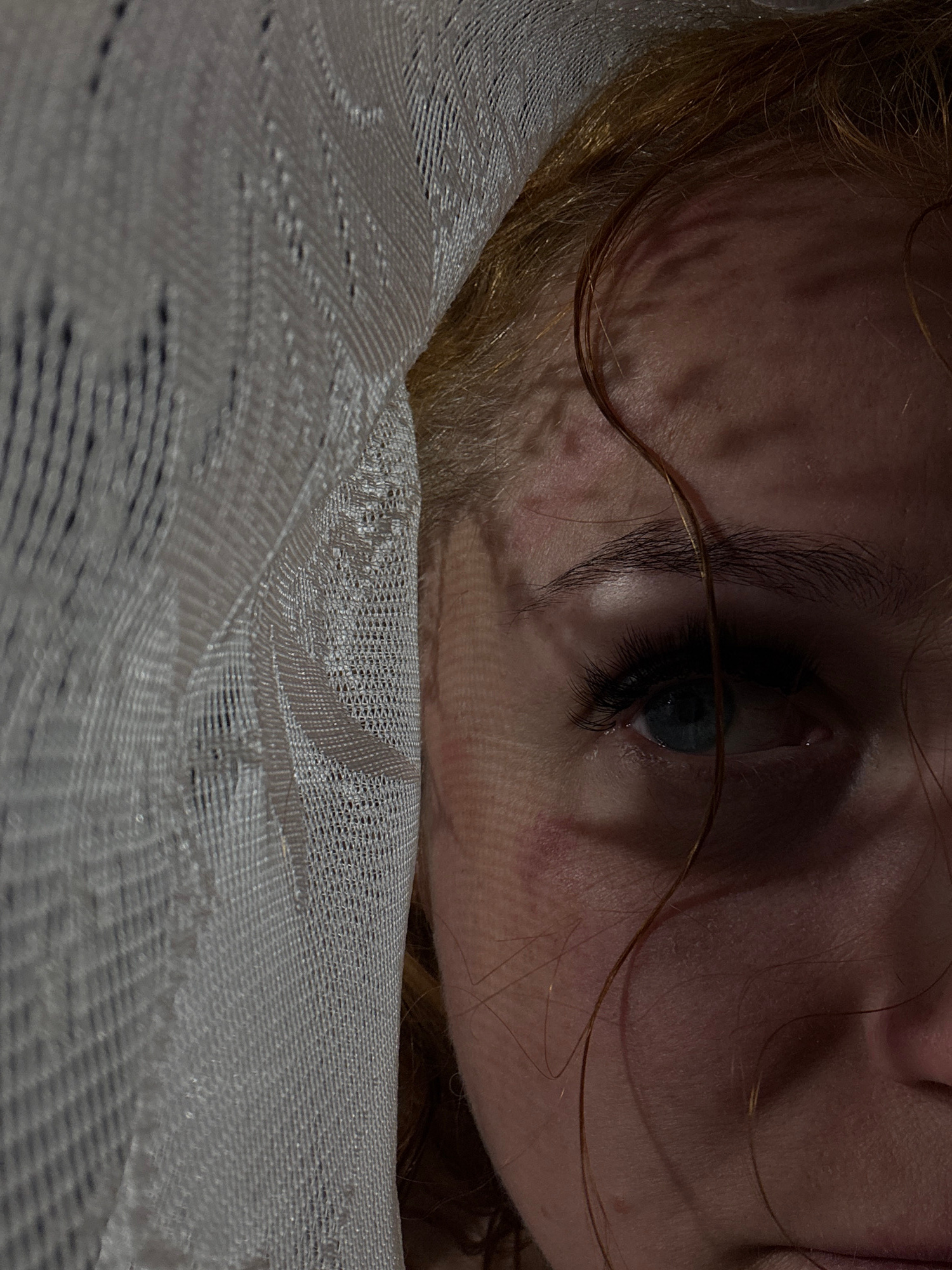 A close-up image shows a person's face partially covered by a white, textured fabric. The person's left eye is visible, displaying a blue iris. A strand of hair crosses over the eye. The skin is fair,…read more