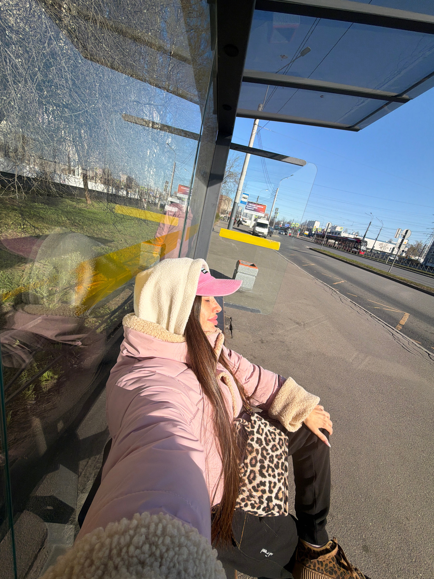 A person lies on a bench at a bus stop. The bus stop has glass sides, and the reflection of trees, grass, and buildings can be seen. Outside the bus stop, there is a road with cars, buildings, and pow…read more