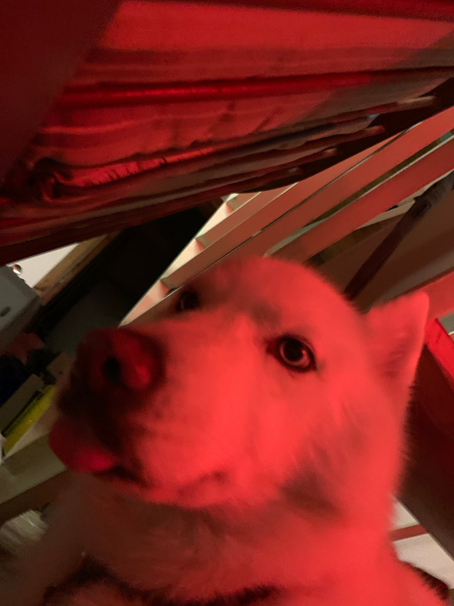 A close-up, slightly distorted view shows a white dog's face under red lighting, possibly emanating from a nearby light source. The dog has dark eyes and a pink nose. The background consists of what a…read more