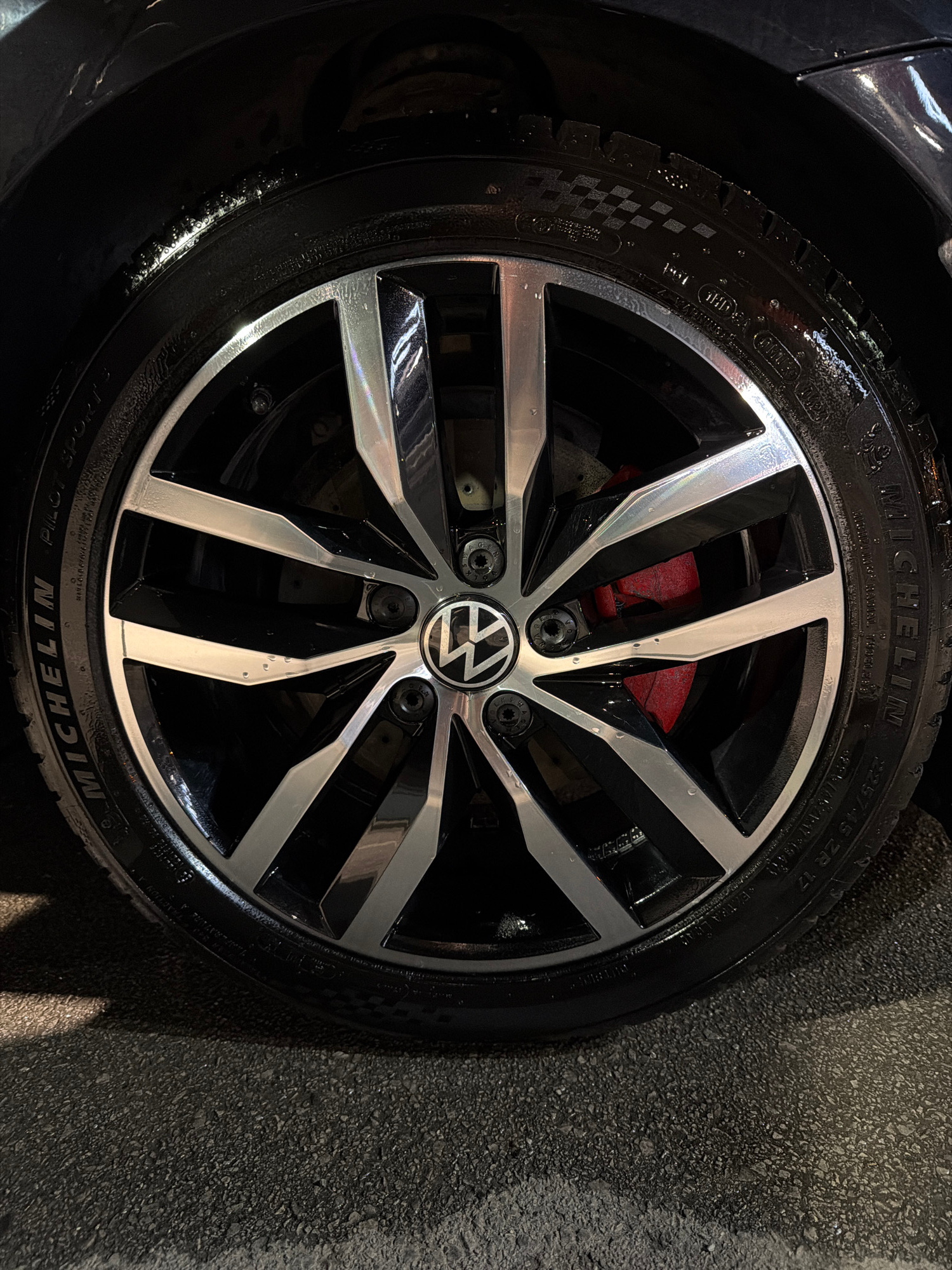 A close-up shot captures a wet car wheel, consisting of a tire and a multi-spoke alloy rim, positioned against a dark background with textured dark grey ground visible on the right. The wheel appears…read more