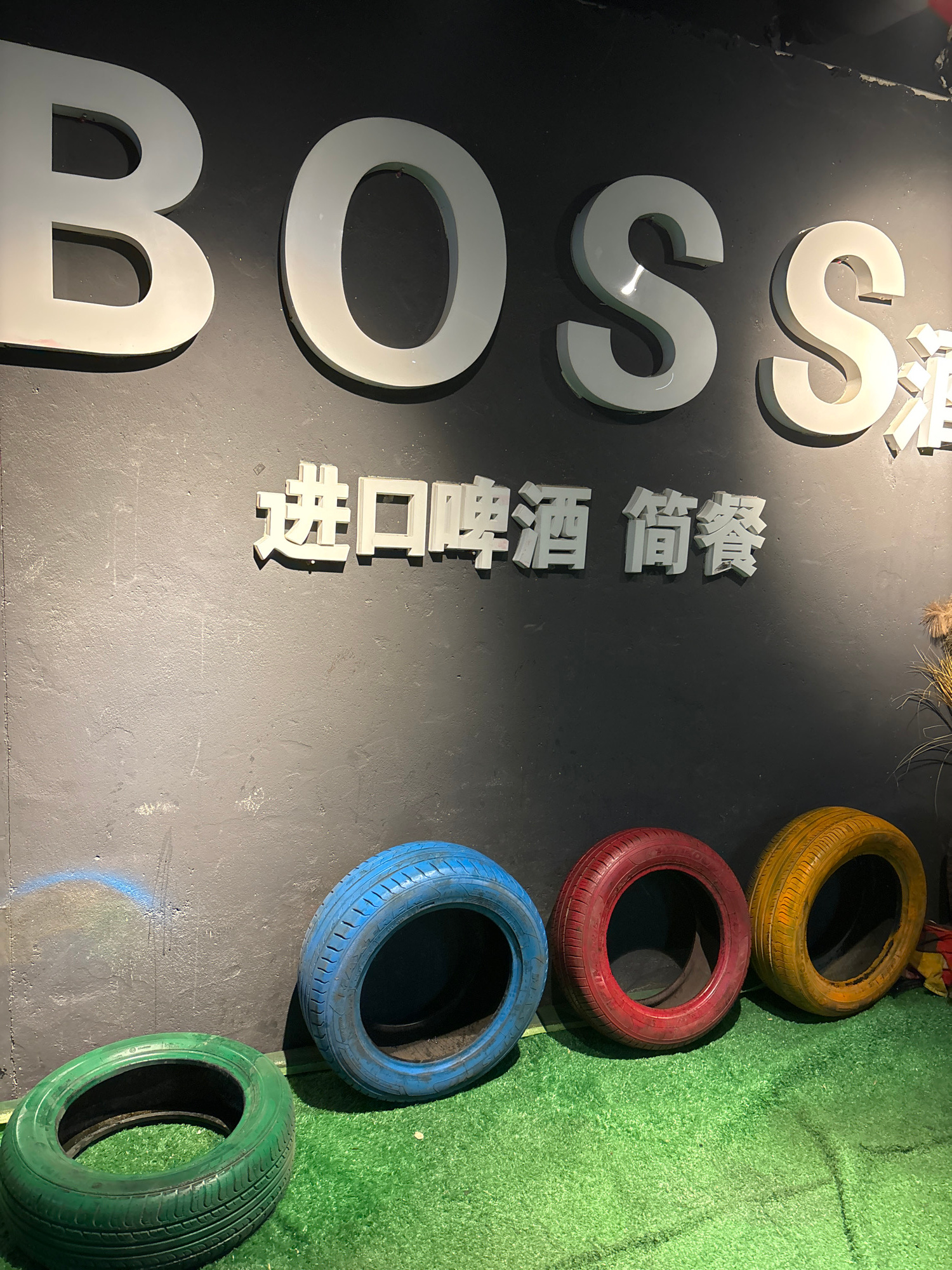 The image shows a wall with the word "BOSS" spelled vertically on the left side, accompanied by Chinese characters next to it. To the right, four tires are painted yellow, red, blue, and green respect…read more
