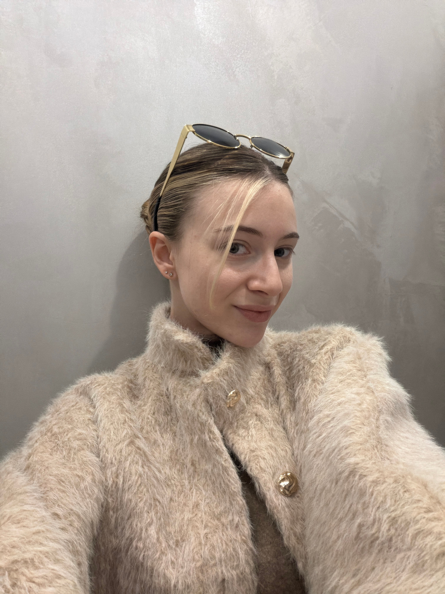 A blonde woman with sunglasses perched atop her head, wears a fuzzy beige coat with gold buttons. She is indoors, posed against a neutral gray wall. The location in the city of Plovdiv, Bulgaria is no…read more