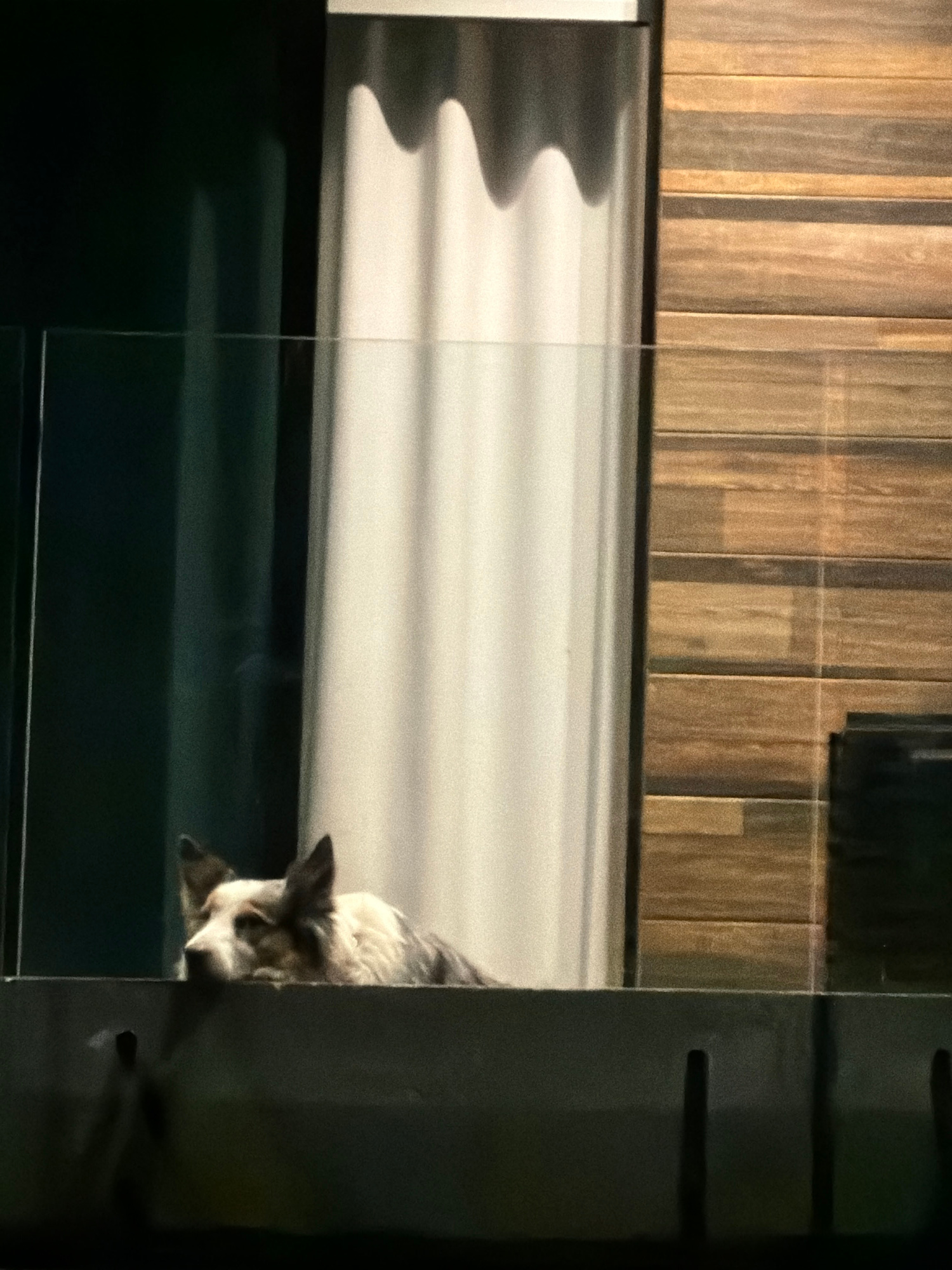 A medium shot captures a glimpse of a dog peeking through a partially open glass door or window, revealing a tiled wall backdrop. The location is Cholula, Mexico. The image is composed of the followin…read more