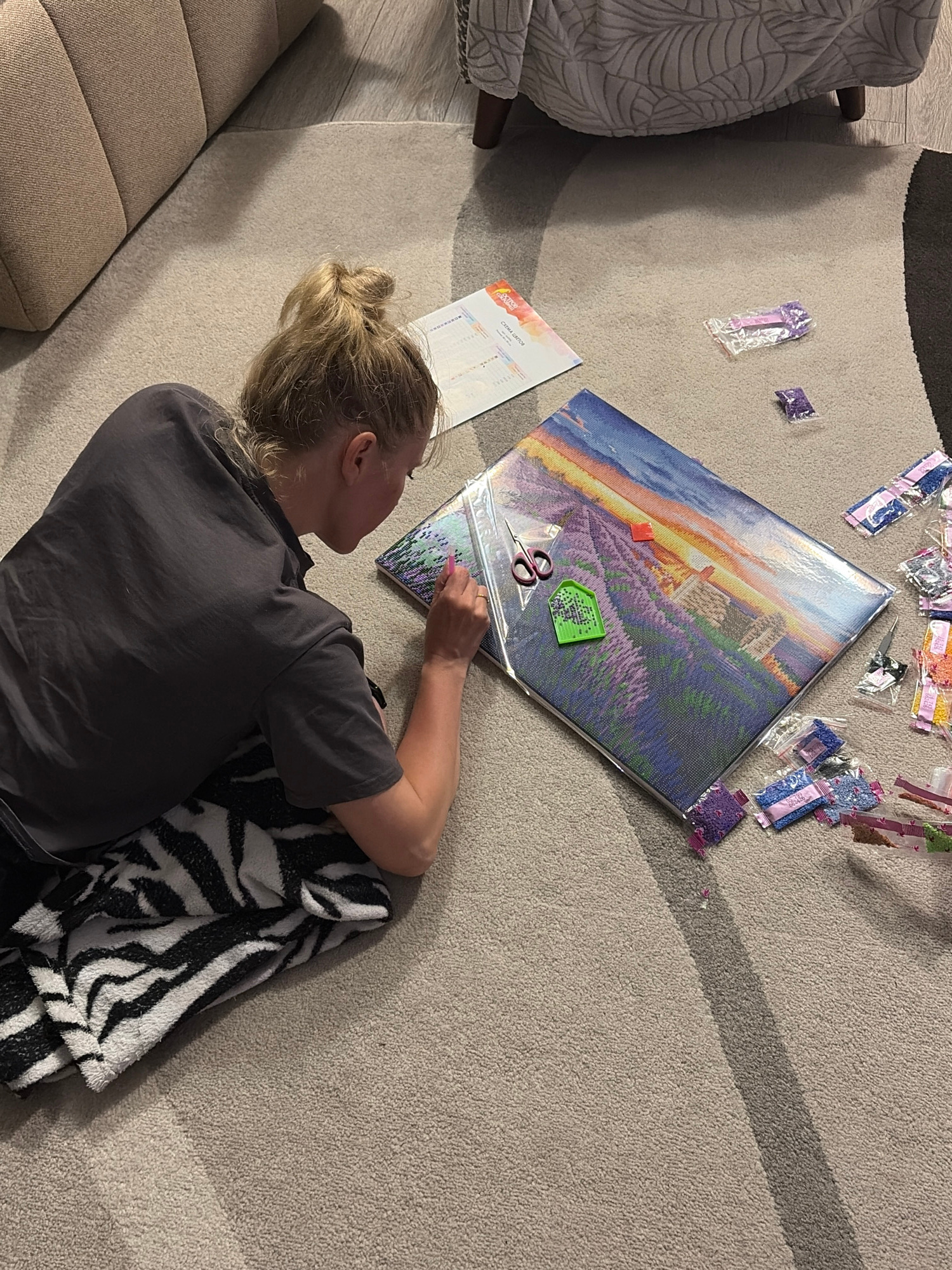 A woman with blonde hair tied in a bun is lying on a beige carpet, working on a diamond painting project. She is wearing a gray t-shirt and resting on a zebra-striped blanket. The diamond painting dep…read more