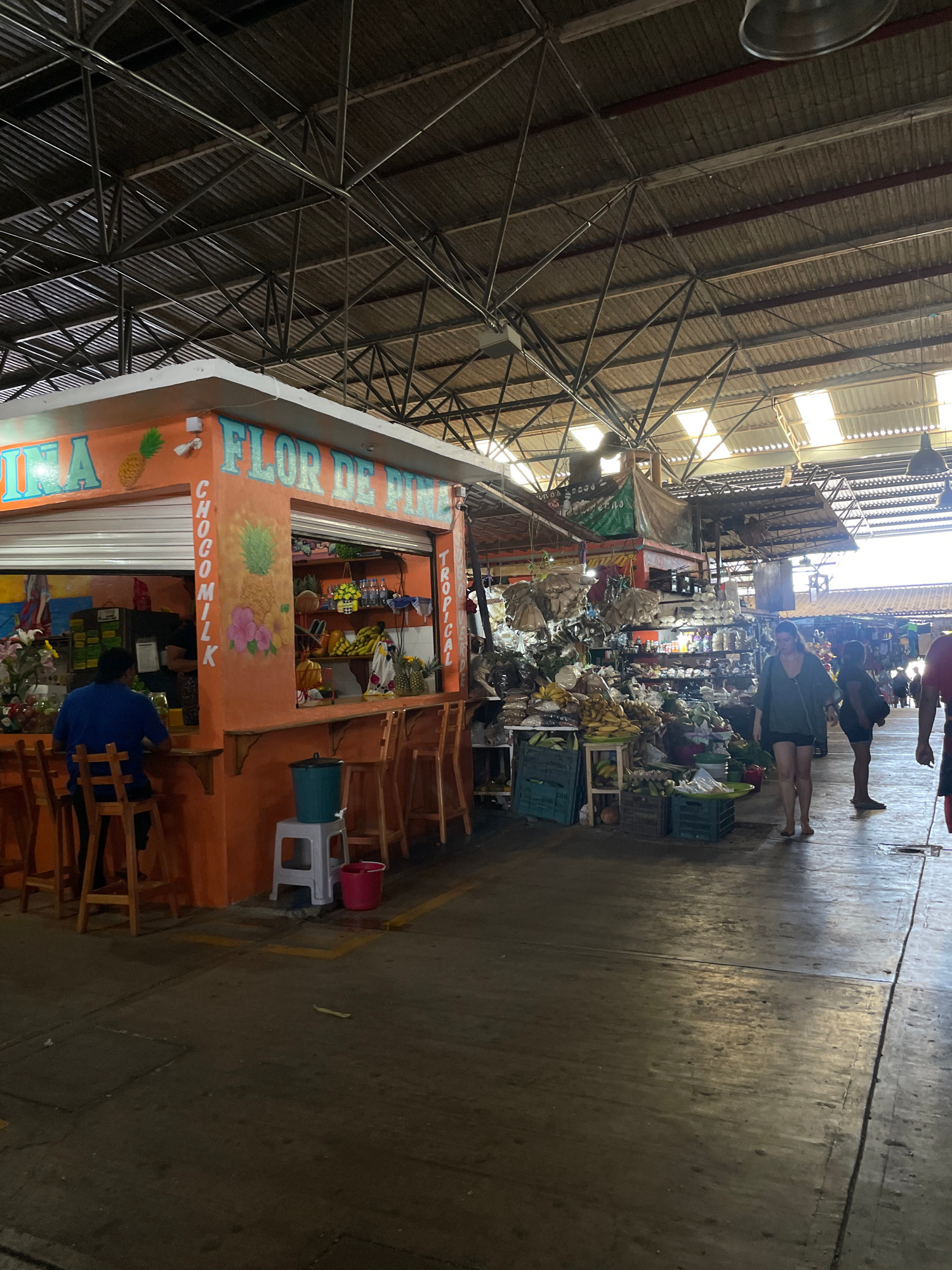 This image depicts a vibrant market scene in Puerto Escondido, Mexico. The scene is centered around a fruit stand with the words "FLOR DE FRUTA TROPICAL CHOC-O-MILK" painted in colorful letters on the…read more