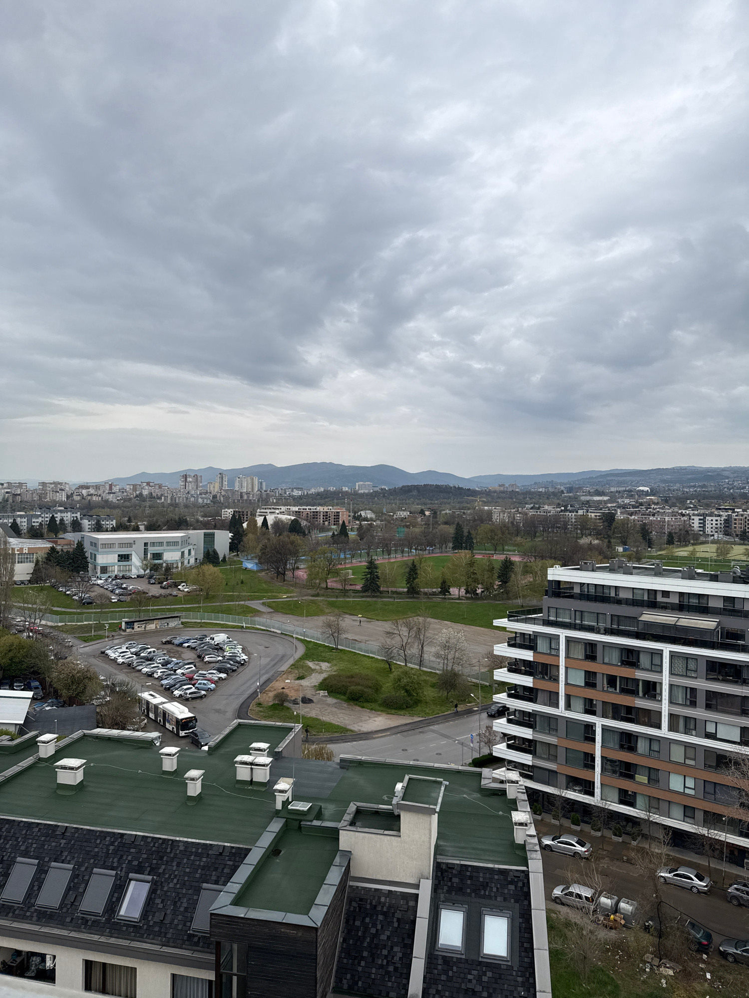 An aerial shot captures a sprawling cityscape under a cloudy sky. The built environment is a mix of residential and commercial structures, some with visible parking areas containing multiple vehicles.…read more
