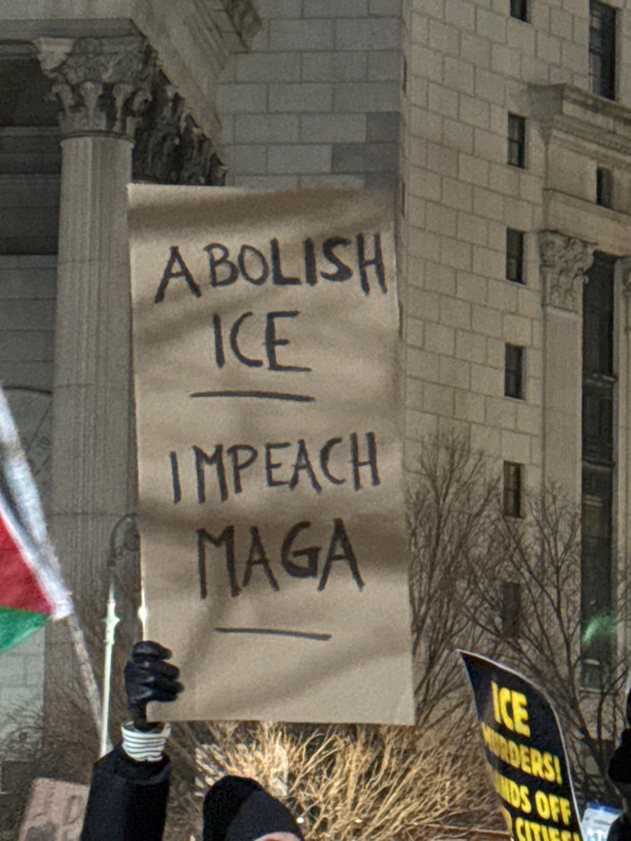 A tan protest sign reads "Abolish ICE" and "Impeach MAGA" in vertical, block lettering with an underscore separating each phrase. A partially visible sign reading "ICE Murderers! Hands Off Cities!" is…read more